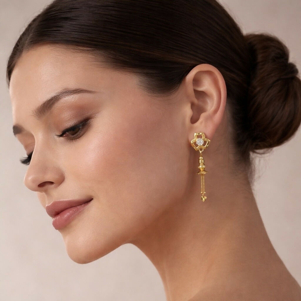 These elegant gold dangle earrings are designed to offer a perfect blend of sophistication and modern charm, featuring a refined teardrop-shaped top highlighted with a sparkling stone that adds a subtle yet eye-catching brilliance; the smooth, polished gold finish enhances their luxurious appeal, while the intricately crafted hanging elements create graceful movement and a delicate flowing effect; lightweight and comfortable for extended wear, they are secured with a sturdy stud backing to ensure a reliable fit throughout the day; their versatile design makes them suitable for both traditional and contemporary outfits, making them an ideal choice for weddings, festive occasions, parties, or everyday elegance, while also serving as a timeless and thoughtful gifting option.