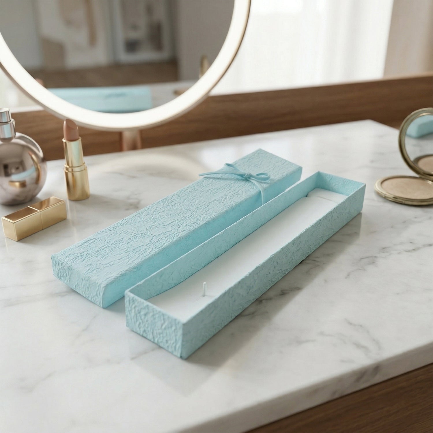 Enhance your gifting experience with this premium long rectangular jewelry box designed for elegance and sophistication. Featuring a refined textured finish and a delicate ribbon tie closure, this box adds a luxurious touch to any special gift. Its sleek and compact design makes it ideal for storing necklaces, chains, and pendants while ensuring they remain secure and tangle-free. The soft inner lining protects delicate jewelry pieces, maintaining their shine and condition. Perfect for creating memorable gifting moments, this stylish box is both functional and visually appealing for everyday or special use.
