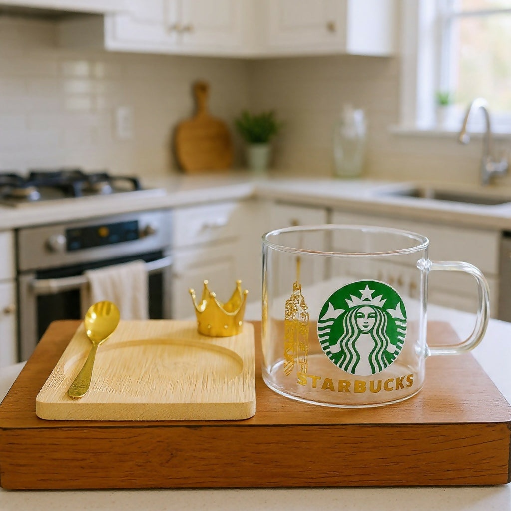 glass coffee mug, transparent mug set, tea cup with tray, coffee mug with spoon, wooden tray mug set, modern kitchen mugs, aesthetic coffee cup, clear glass cup, gift mug set, tea coffee serving set