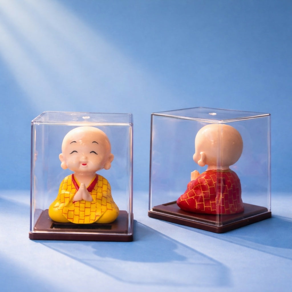 Add a cheerful and calming touch to your space with this solar-powered monk bobble head. Designed to gently move its head when exposed to light, this figurine brings a lively and relaxing vibe to any setting. The transparent display case keeps it protected while allowing full visibility, making it perfect for desks, car dashboards, or home decor. A delightful combination of positivity and motion, ideal for everyday decoration or gifting.