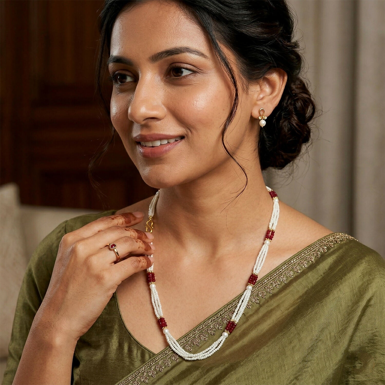 This elegant beaded pearl mala showcases a timeless traditional design with a refined modern touch. Featuring multiple strands of fine white beads paired with rich red accents and golden highlights, it creates a graceful and balanced look. The evenly spaced design gives it a clean and sophisticated appearance, making it perfect for festive wear, cultural occasions, and daily ethnic styling. Lightweight and comfortable, it sits beautifully on the neckline without feeling heavy. A versatile accessory that enhances sarees, kurtis, and traditional outfits effortlessly.