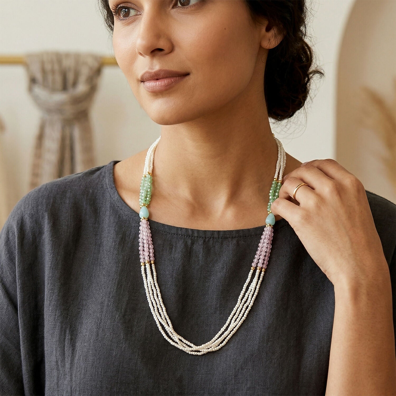 This graceful layered pearl mala necklace features delicate white pearl strands paired with soft pastel green and pink bead accents for a subtle yet elegant look. The multi-layered design at the bottom creates a beautiful flow, adding charm and sophistication. Handmade craftsmanship gives it a unique and refined finish. Ideal for daily wear, festive occasions, and ethnic outfits, it enhances your overall style effortlessly. Lightweight and comfortable, it is perfect for long wear with a classy appeal.