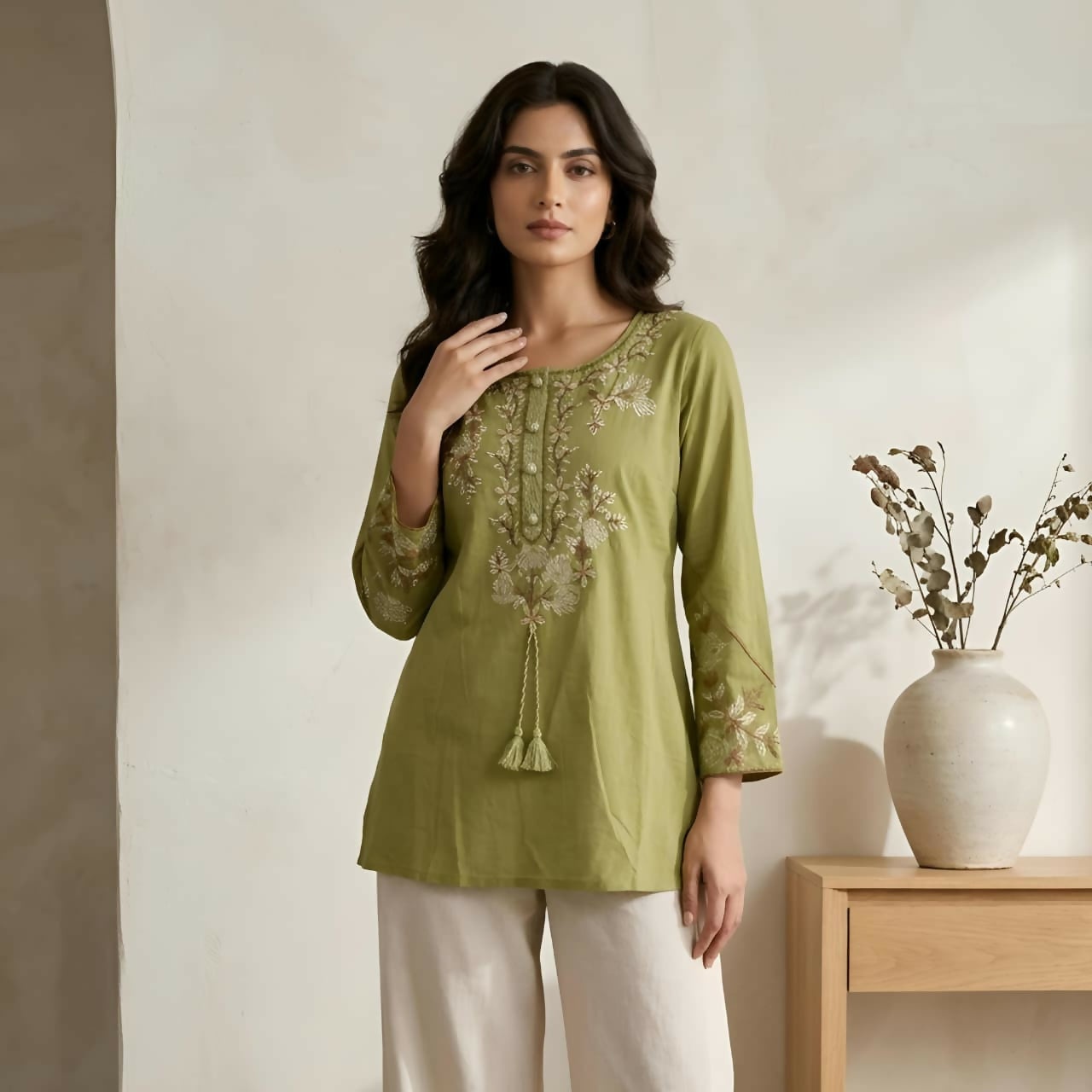 Women Dark Green Embroidered Cotton Khadi Short Kurta Top | Mehendi Ethnic Wear