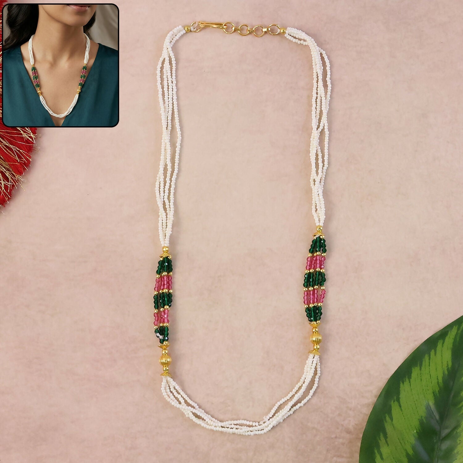 Enhance your ethnic look with this beautifully handcrafted white beaded mala necklace featuring a striking combination of green and pink traditional beadwork. Designed with fine detailing and multiple bead strands, this piece brings a graceful and timeless charm to any outfit. The handcrafted design adds uniqueness, making it stand out for festive occasions, cultural events, and daily traditional wear. Its lightweight structure ensures comfortable wear throughout the day while maintaining a rich and elegant appearance. A perfect choice for those who appreciate handmade jewelry with classic traditional aesthetics.