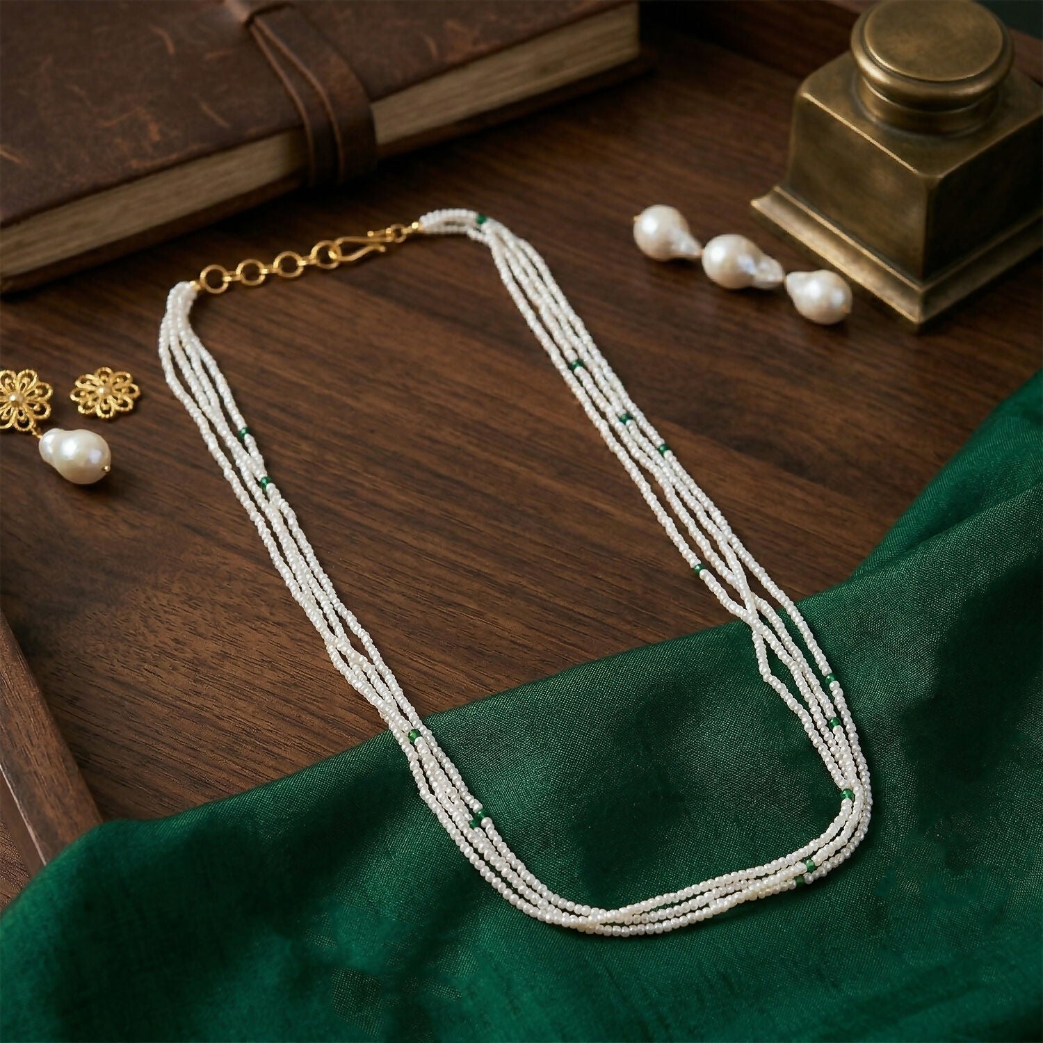 Enhance your traditional and modern look with this elegant multi-layer beaded mala designed with delicate white beads and subtle green accents. The layered mala design gives a graceful and sophisticated appearance, making it perfect for festive wear, daily styling, or office outfits. Its minimal yet stylish look pairs beautifully with both ethnic and contemporary attire. Lightweight and comfortable, this mala can be worn all day without any discomfort. A perfect gifting choice for girls and women who love simple, classy, and timeless jewelry pieces.