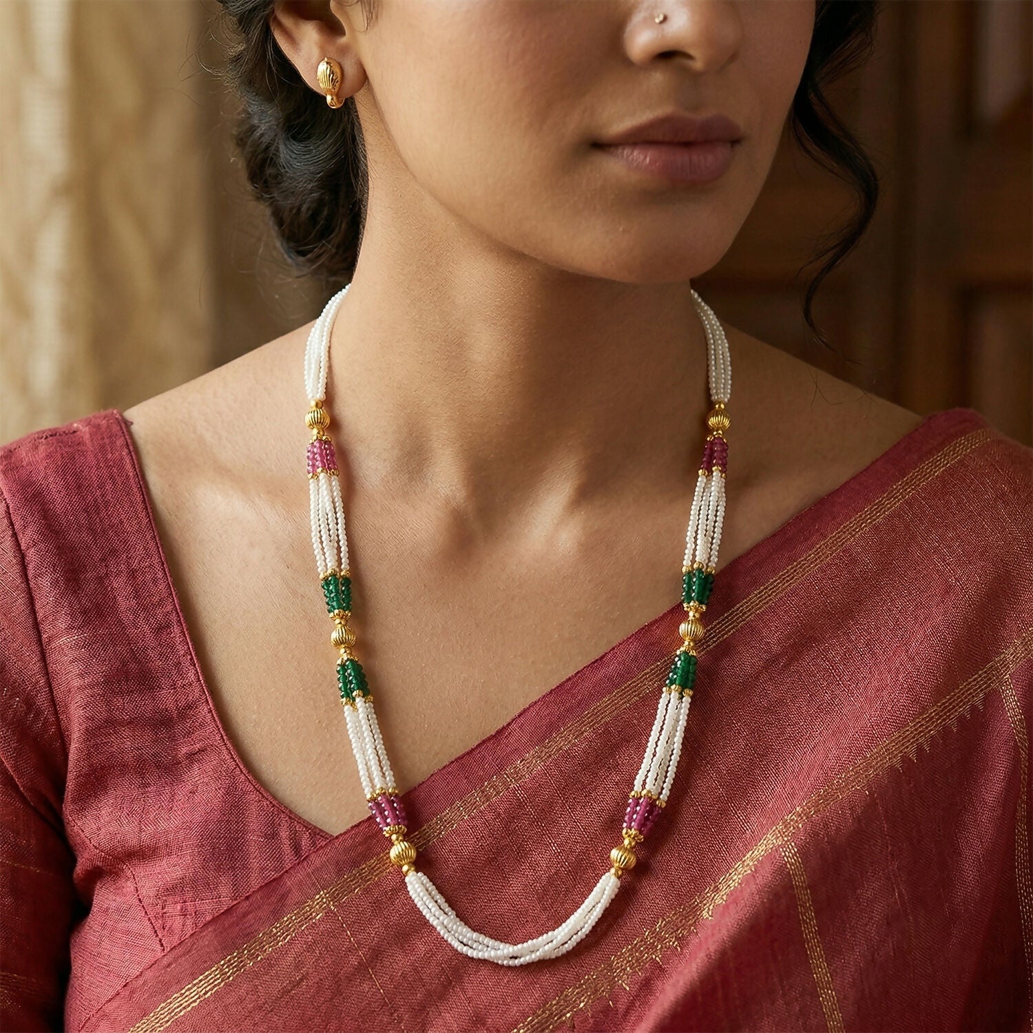 Elevate your ethnic style with this beautifully crafted multi-layer traditional mala featuring delicate white beads combined with rich green and pink accents. Designed with elegant gold-toned detailing, this mala offers a perfect blend of classic charm and modern sophistication. Its graceful layered pattern enhances your overall look, making it ideal for festive occasions, traditional events, or daily ethnic wear. Lightweight and comfortable, it ensures effortless wear throughout the day. A perfect gifting choice for girls and women who appreciate timeless and elegant jewelry pieces.