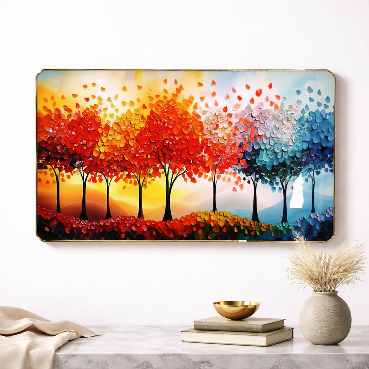 Add a vibrant and artistic touch to your home with this premium 3D tree wall art panel, designed to bring color, depth, and elegance into any space. Featuring a stunning row of abstract trees in a beautiful gradient of warm reds, oranges, and cool blues, this artwork symbolizes harmony, balance, and nature’s beauty.