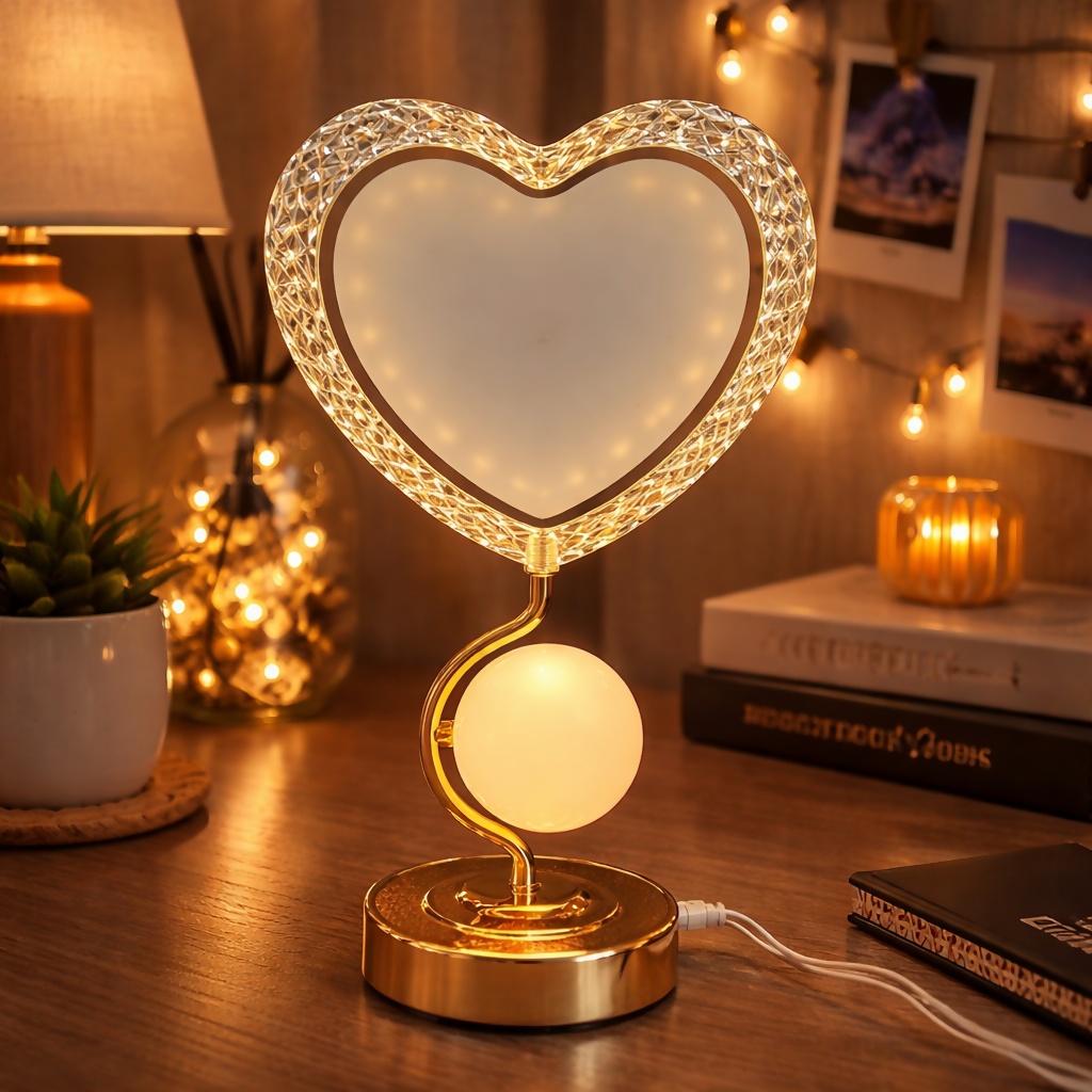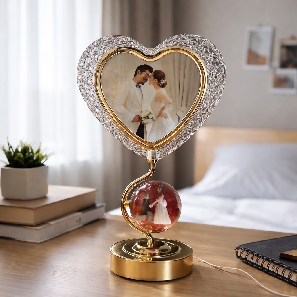 Enhance your space with this beautifully designed heart-shaped LED photo frame lamp. Crafted with a crystal-style outer frame and elegant metallic finish, it highlights your cherished memories with a soft glowing light. The dual display design features a large heart frame for your main photo and a smaller decorative globe below, creating a romantic and eye-catching look. Ideal for bedroom desks, side tables, and gifting, this lamp adds warmth and charm to any setting.