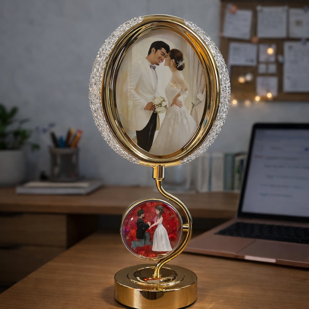 Add a romantic and elegant touch to your space with this LED photo frame lamp. Designed with a stylish dual-frame structure, it beautifully displays your favorite memories while creating a warm ambient glow. The top frame highlights a large photo with soft LED lighting, while the bottom frame adds a charming decorative element. Perfect for bedrooms, desks, and gifting occasions, this lamp enhances any setting with its premium finish and soothing illumination.