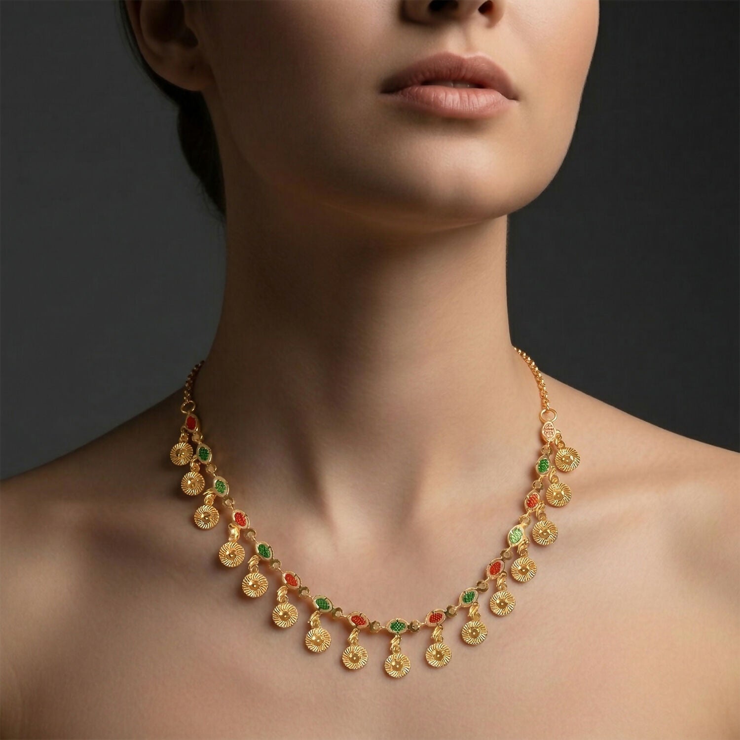 Add a touch of traditional elegance to your look with this beautifully crafted gold charm necklace. Designed with delicate dangling coin charms and vibrant multicolor stone accents, this piece reflects timeless ethnic beauty. The lightweight chain ensures comfortable wear, while the intricate detailing makes it perfect for festive occasions, weddings, or cultural celebrations. Pair it with ethnic or fusion outfits to create a graceful and eye-catching statement.