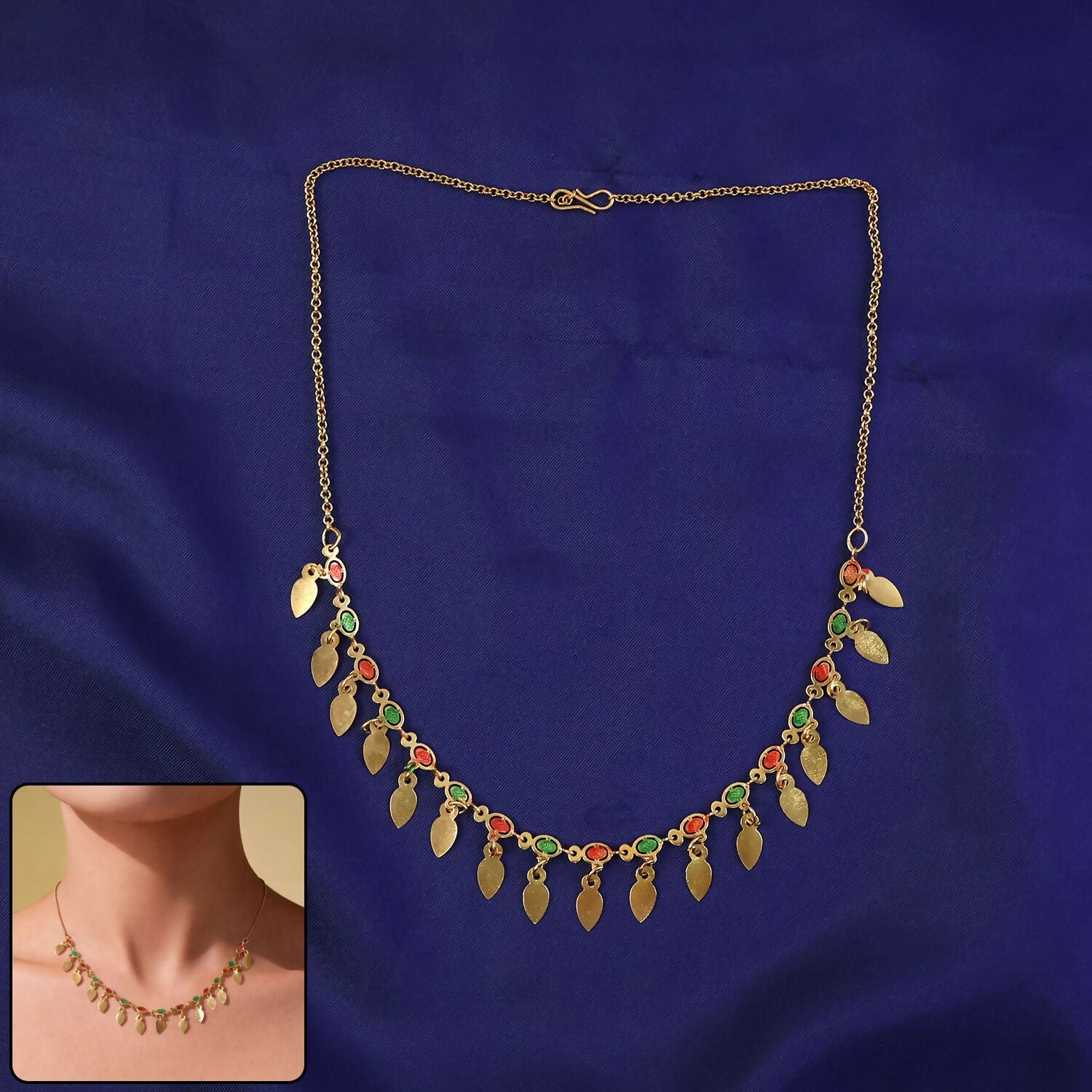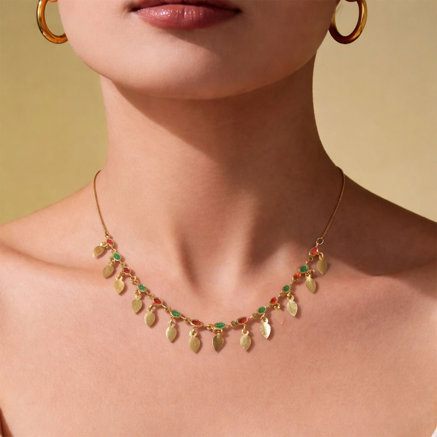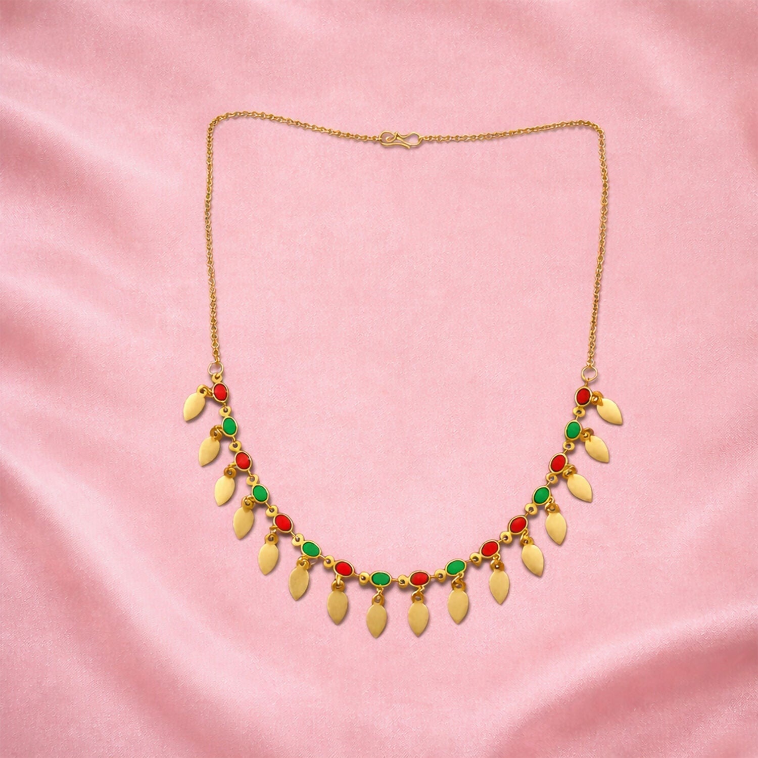 Elevate your style with this elegant gold-tone necklace featuring delicate leaf charms and vibrant multicolor stones. The intricate design combines nature-inspired elements with a modern touch, creating a graceful and eye-catching look. Lightweight and versatile, it’s perfect for festive occasions, casual outings, or party wear. A beautiful statement piece that also makes a thoughtful gift.