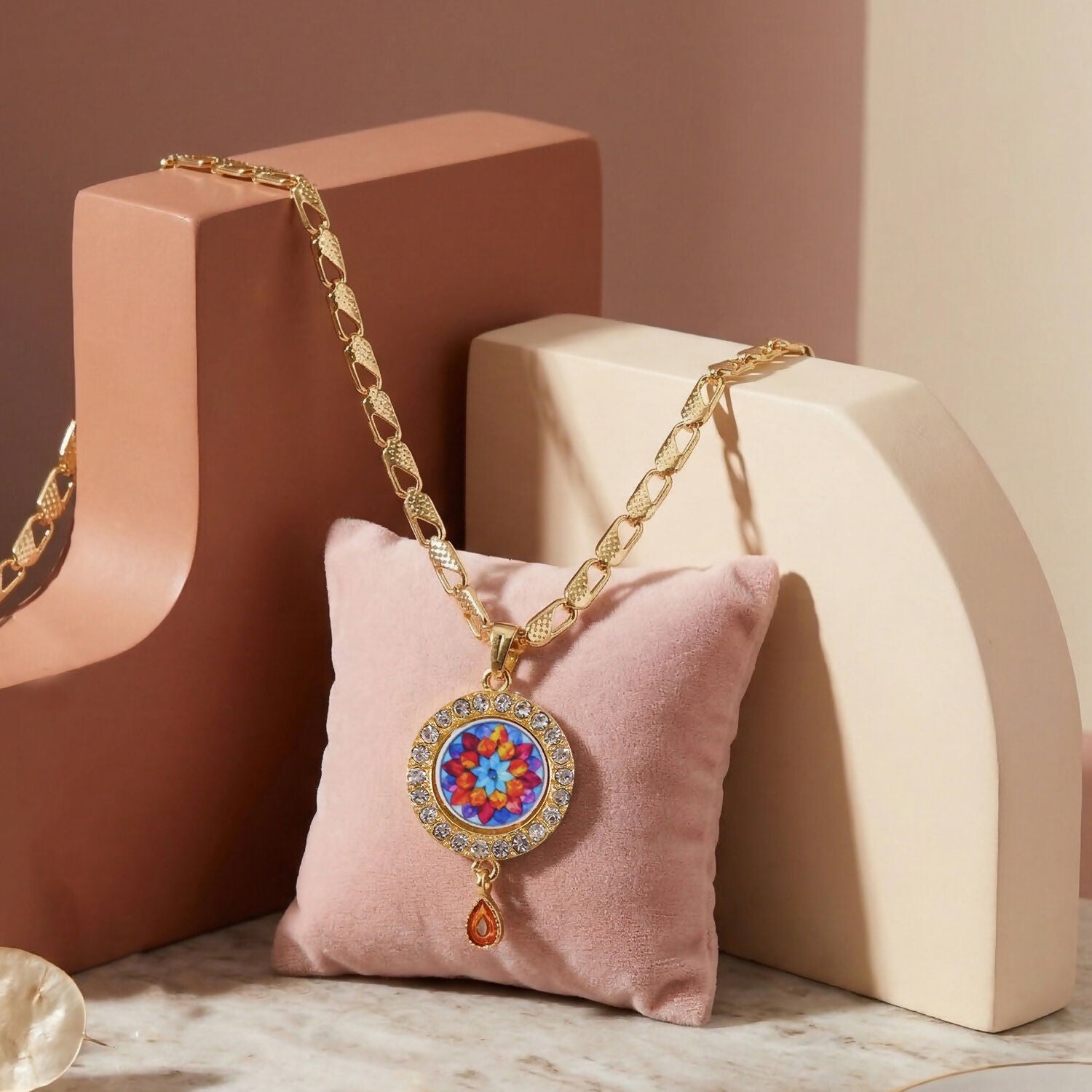Enhance your style with this stunning gold pendant necklace featuring a vibrant multicolor floral design at the center. Surrounded by a sparkling stone-studded border and finished with a delicate drop accent, this piece blends elegance with modern charm. The premium gold-toned chain adds a luxurious touch, making it perfect for festive occasions, weddings, or everyday sophistication. A timeless accessory that effortlessly elevates any outfit.