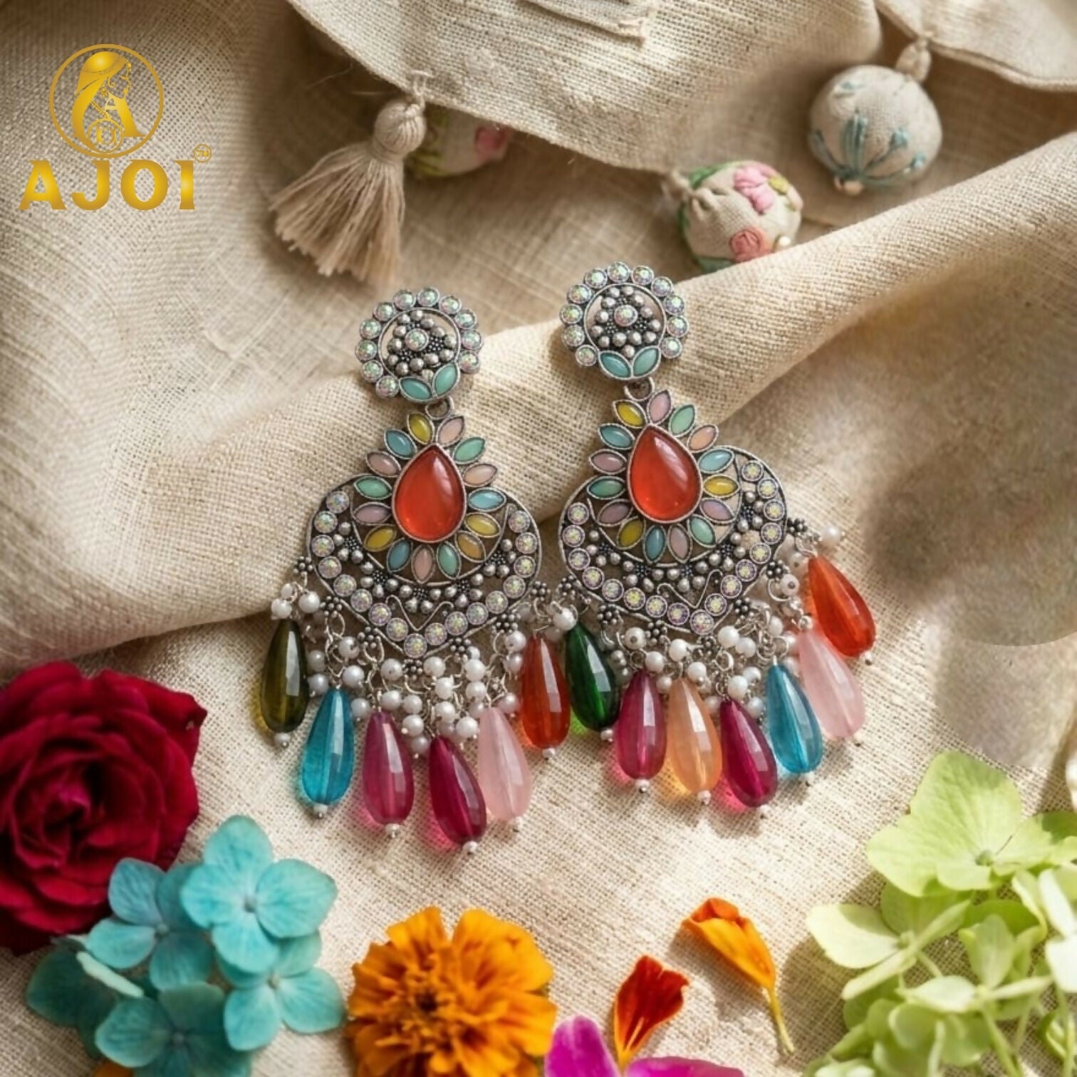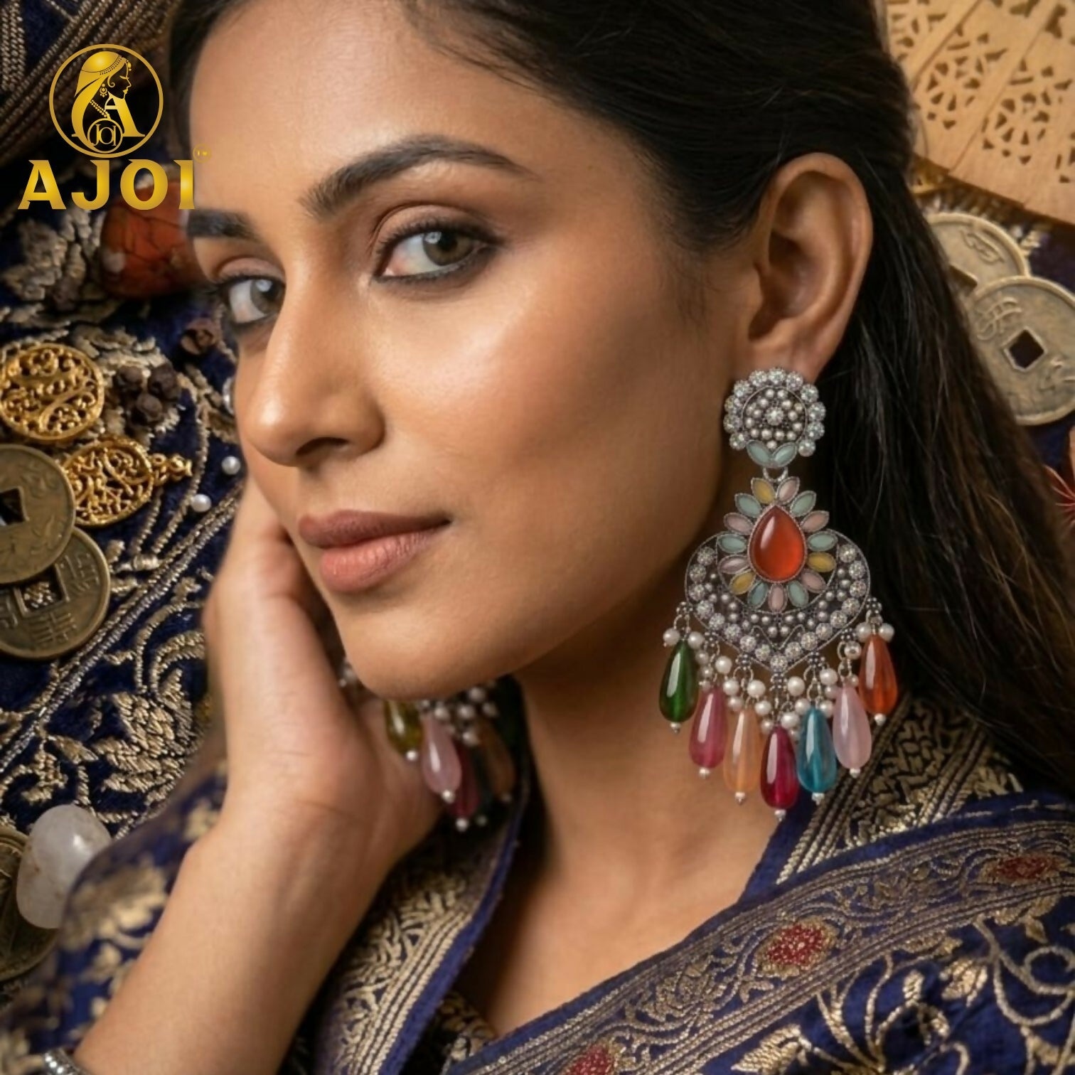 Exquisite oxidized earrings featuring a bold teardrop centerpiece surrounded by delicate pastel stones and intricate detailing. Accented with vibrant multicolor bead drops and elegant pearl tassels, these earrings bring graceful movement and charm. Perfect for festive occasions, weddings, and ethnic ensembles, they offer a unique blend of traditional craftsmanship and modern style while remaining lightweight and comfortable.