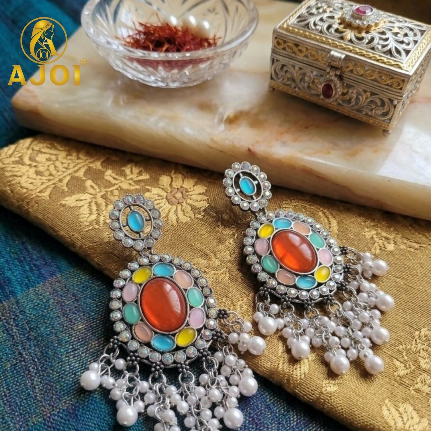 Elegant oxidized earrings featuring a bold oval centerpiece accented with vibrant multicolor stones and shimmering detailing. The intricate craftsmanship is enhanced with delicate pearl tassel drops that add graceful movement and charm. Perfect for festive occasions, weddings, and ethnic wear, these statement earrings combine traditional artistry with a modern touch while remaining lightweight and comfortable for all-day wear.