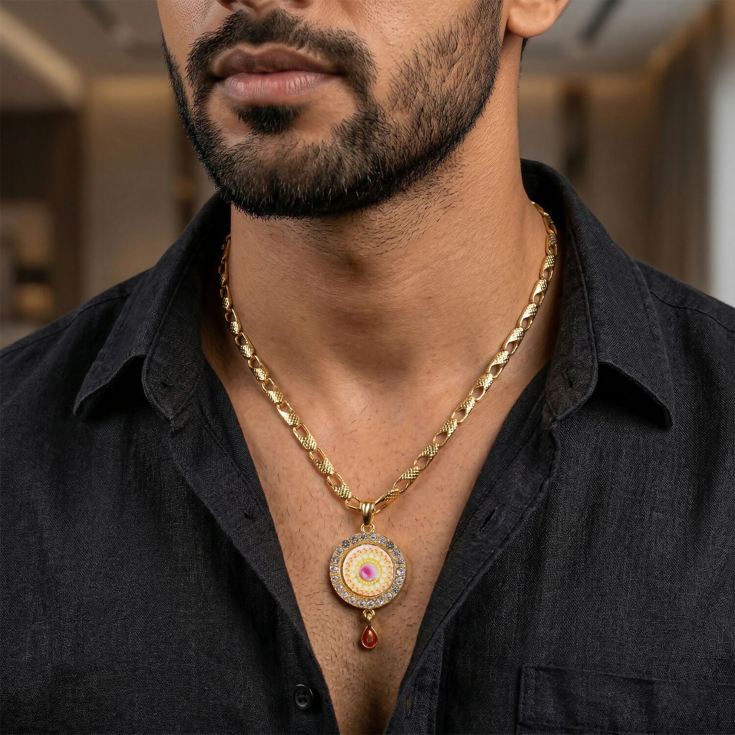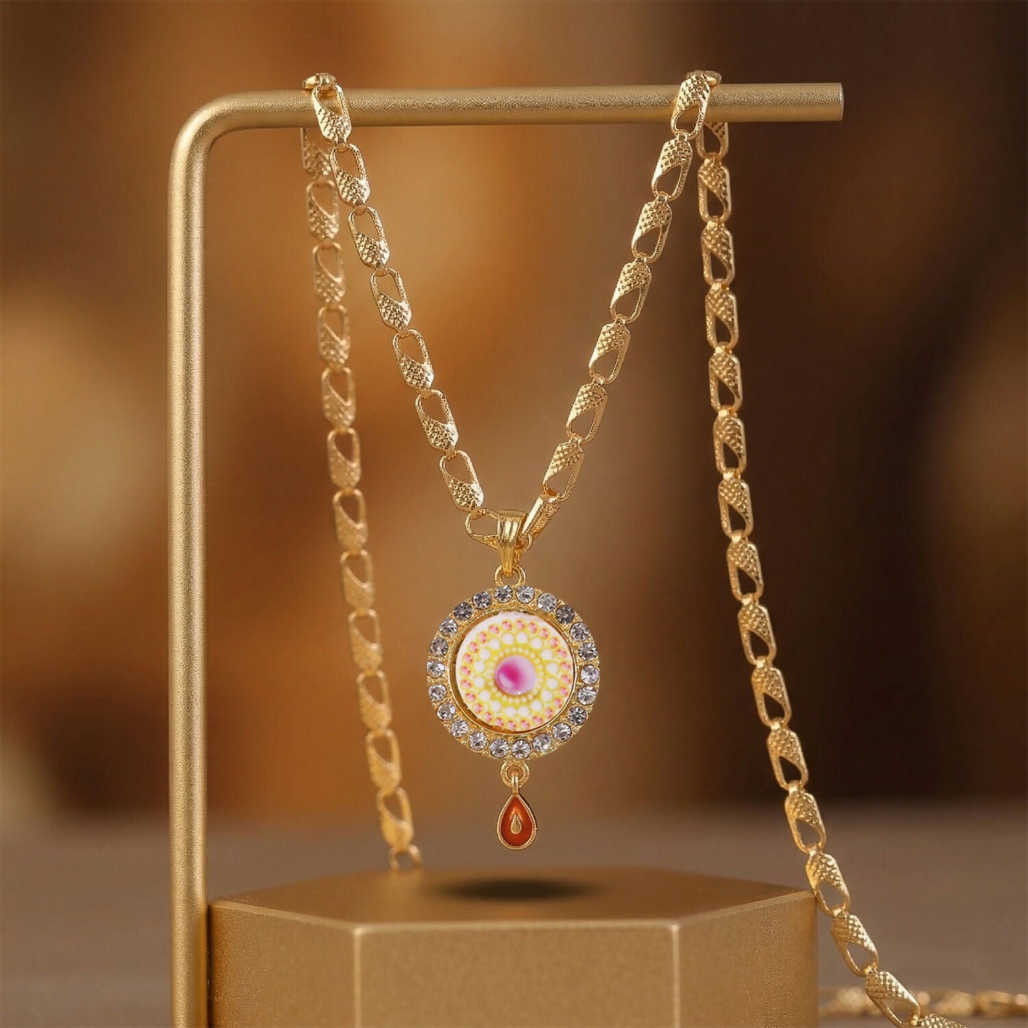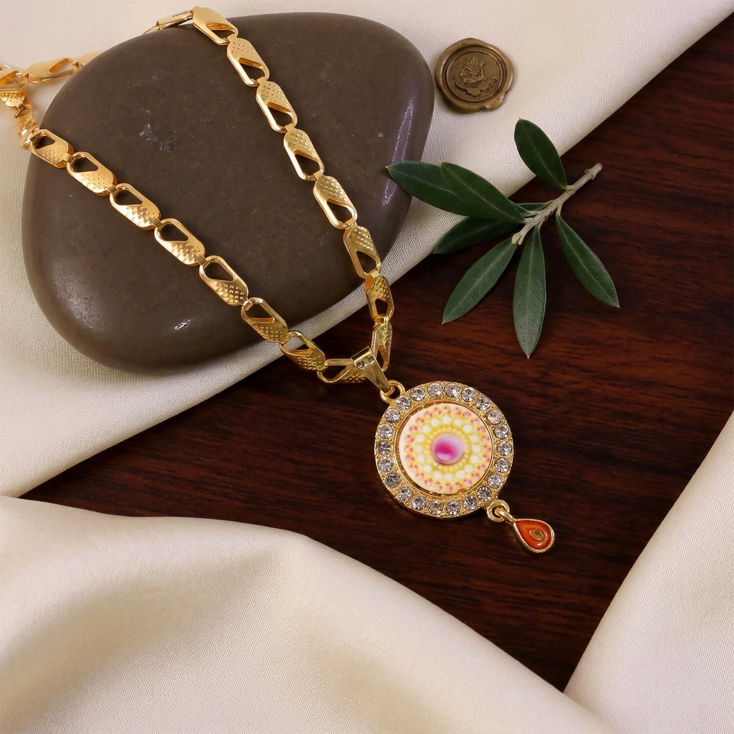 Add a touch of elegance to your jewelry collection with this stunning gold-plated pendant necklace. Featuring a beautifully detailed circular design with a vibrant center and sparkling stone-studded border, it exudes charm and sophistication. The stylish chain and delicate drop accent enhance its appeal, making it perfect for festive wear, parties, or everyday elegance. A timeless piece that also makes a thoughtful gift.