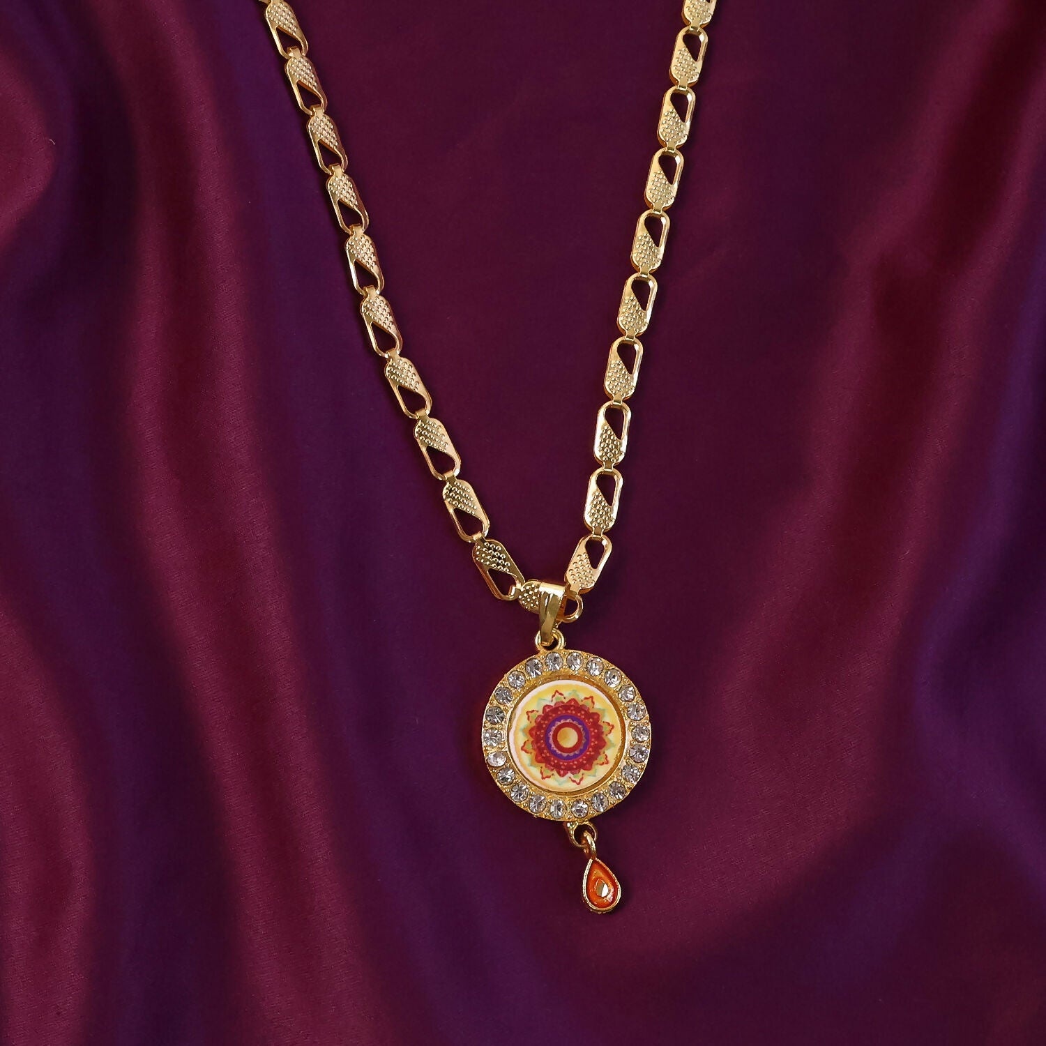 Enhance your look with this elegant gold pendant necklace featuring a vibrant mandala design at the center, surrounded by sparkling stone detailing. The intricate craftsmanship and rich colors create a perfect blend of tradition and modern style. Ideal for festive wear or special occasions, this piece adds a graceful and eye-catching touch to any outfit.
