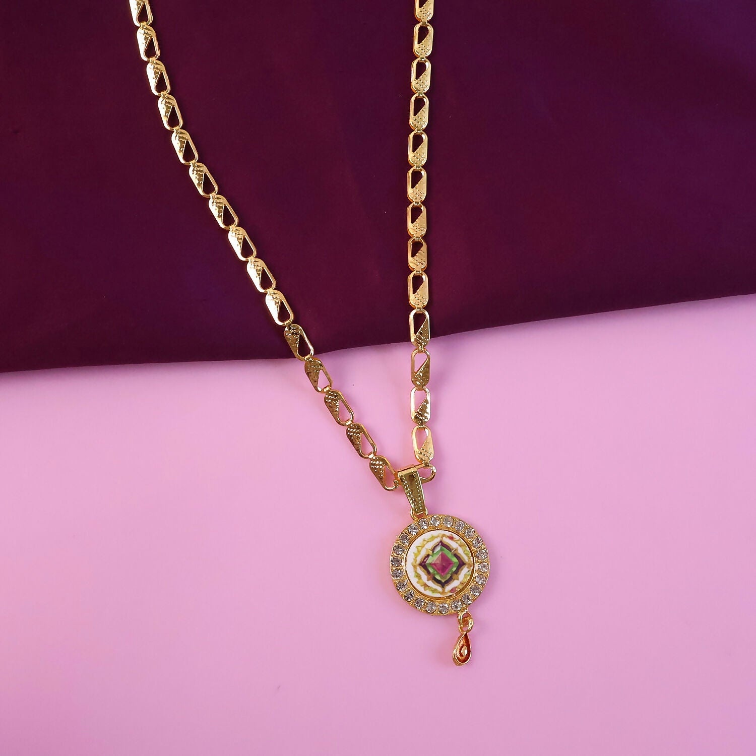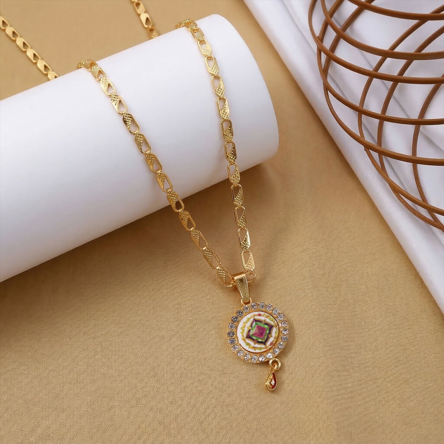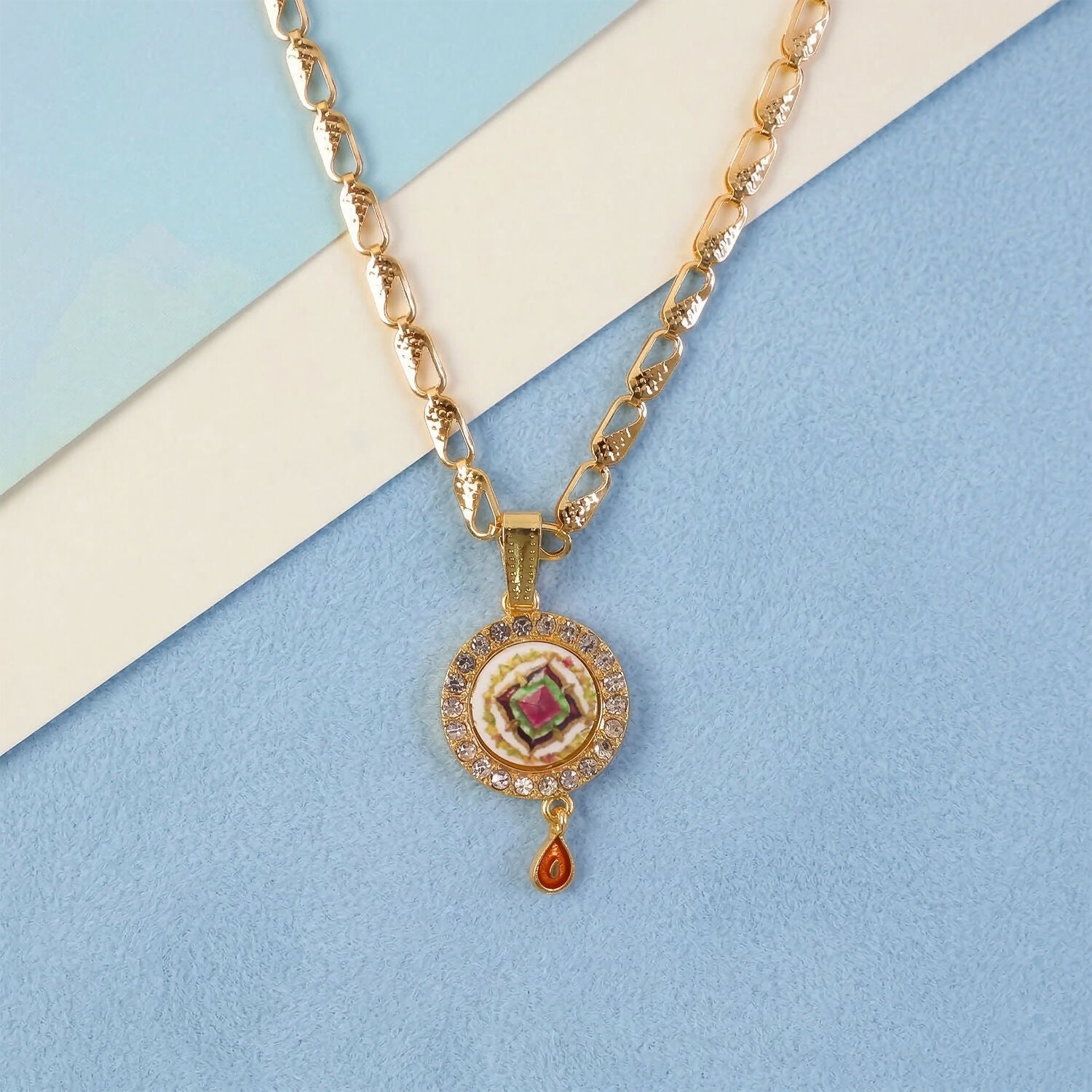 Upgrade your jewelry collection with this elegant gold pendant necklace featuring a vibrant mandala design at the center, encircled by sparkling stone detailing. The unique pattern and rich colors create a perfect balance of tradition and modern style. Ideal for festive occasions or everyday elegance, this piece adds charm and sophistication to any outfit.