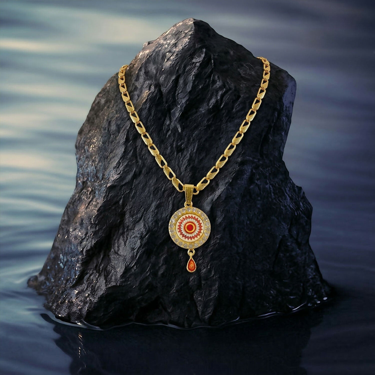 Make a bold statement with this royal gold pendant necklace featuring a beautifully detailed circular design accented with vibrant enamel and sparkling stones. The intricate pattern and rich color tones give it a luxurious and traditional appeal. Perfect for special occasions or festive wear, this elegant piece adds a touch of sophistication and charm to any look.