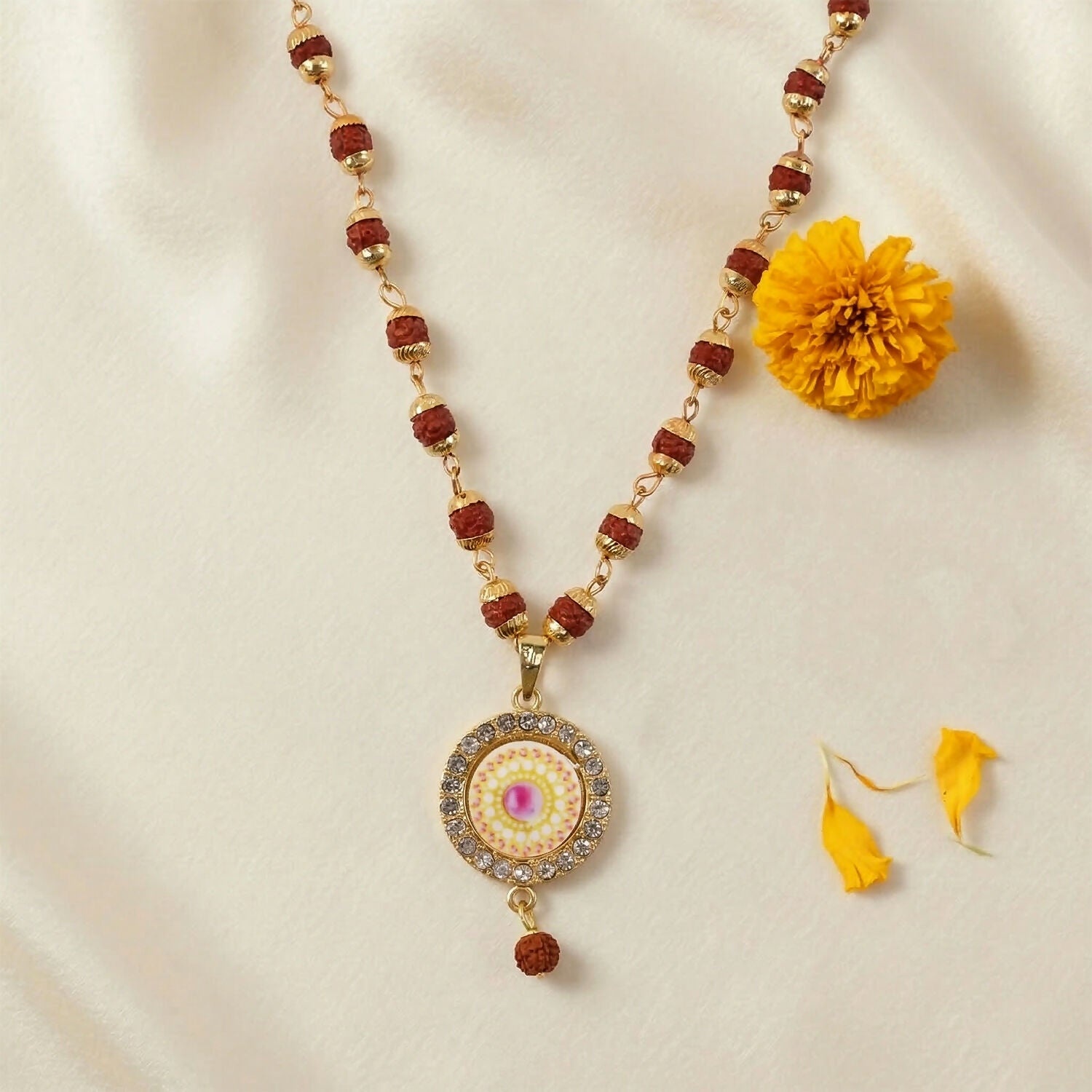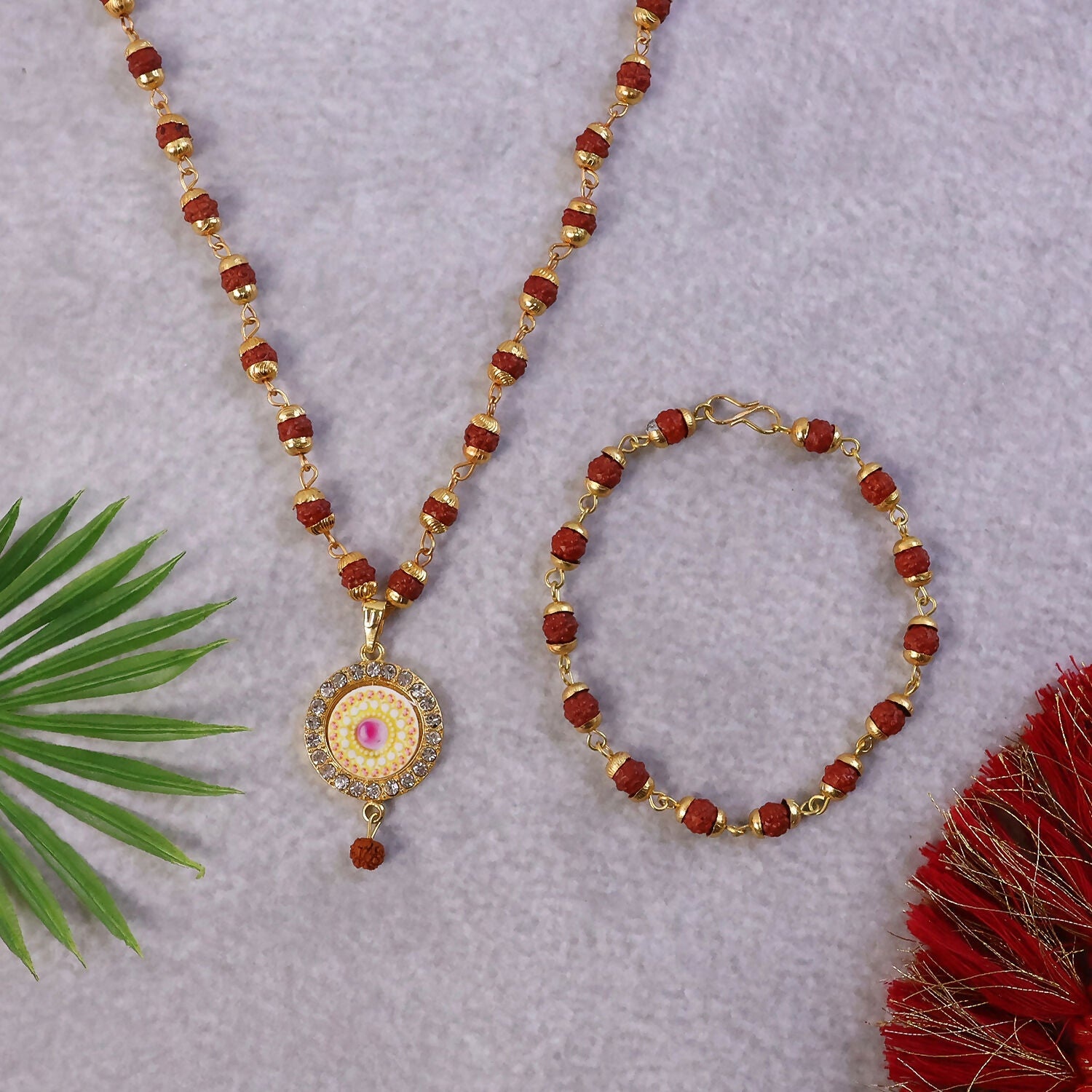 Embrace tradition and elegance with this Rudraksha gold necklace and bracelet set. Featuring beautifully spaced Rudraksha beads and a stunning designer pendant with intricate detailing and sparkling accents, this set offers a perfect blend of spirituality and style. Ideal for daily wear, festive occasions, or gifting, it adds a graceful and meaningful touch to any look.
