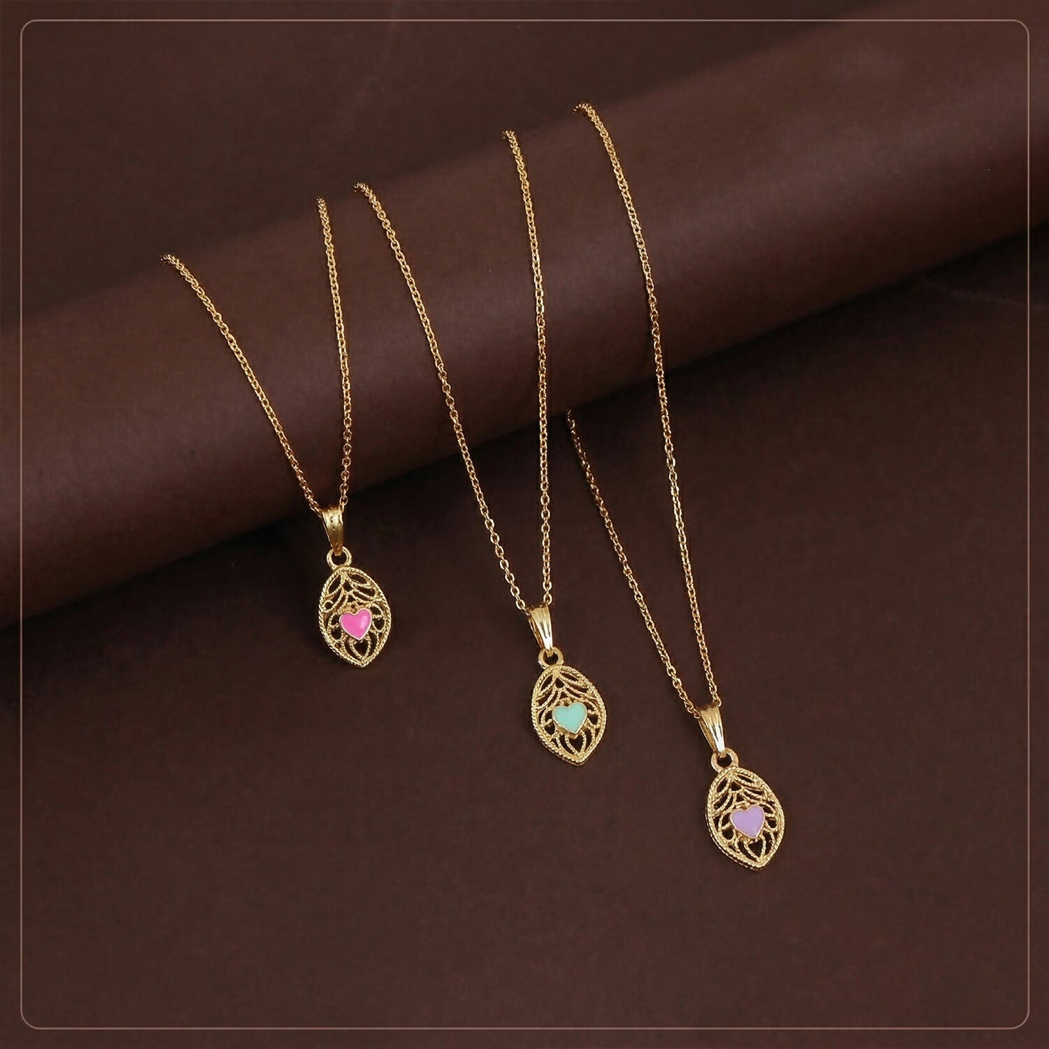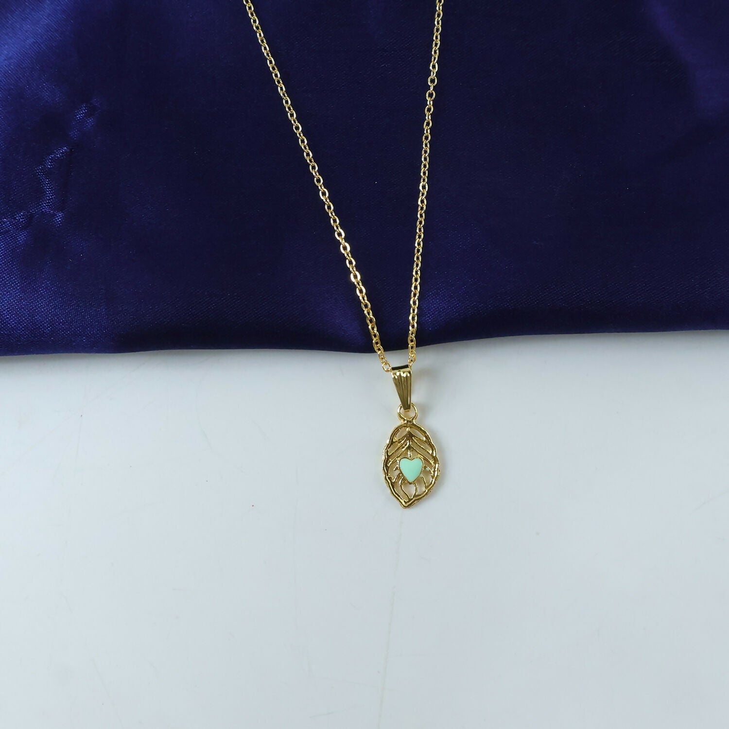 Enhance your style with these elegant gold pendant necklaces featuring a delicate leaf design and a charming enamel heart at the center. Crafted with fine detailing and a polished finish, each piece adds a subtle touch of romance and sophistication. Perfect for everyday wear or as a meaningful gift, these lightweight necklaces complement any outfit beautifully.