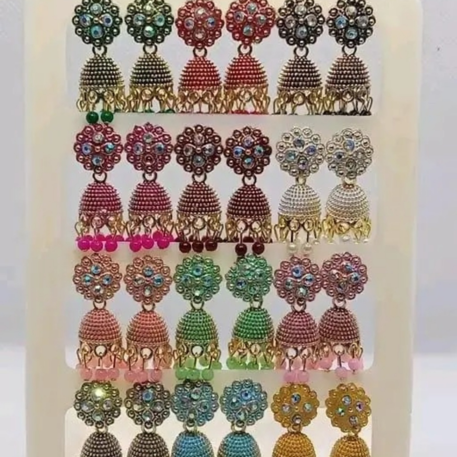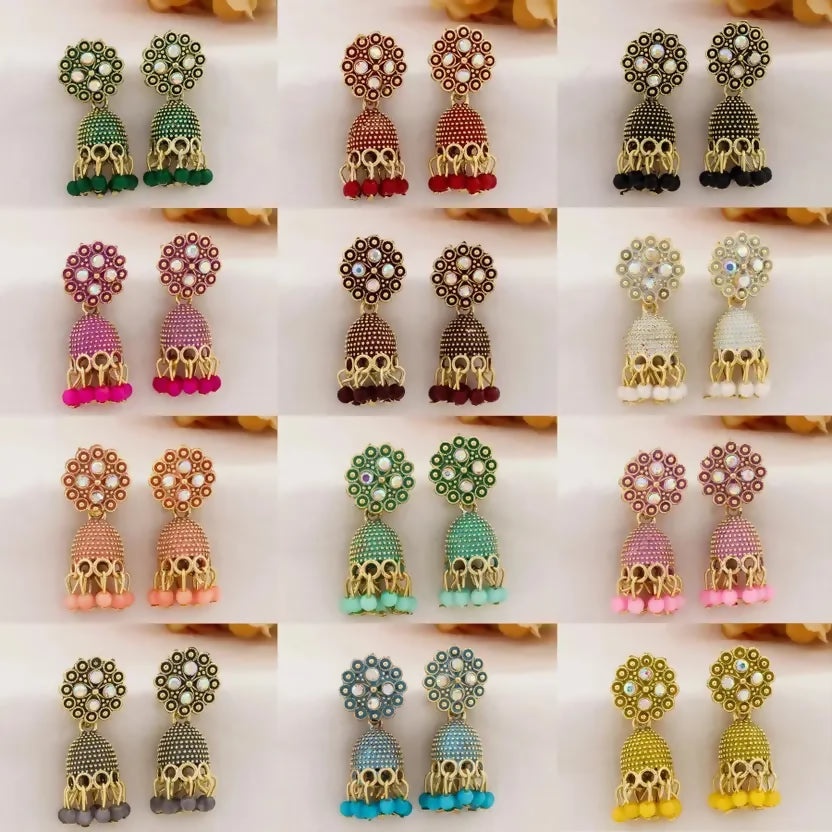 Ethnic Western Best Quality Stone Oxidize Type Small Earring Jumki For Women And Girls(Combo Of 12 Color And Pair) In Color Green, Red, Black, Pink, Maroon, White, Peach, Pista, Baby Pink, Grey, Aqua, Yellow