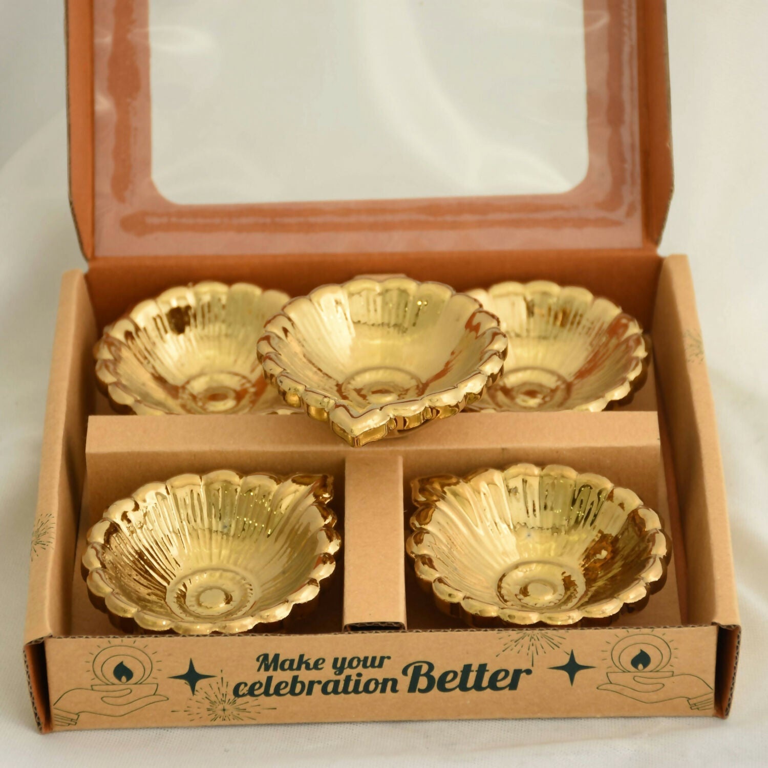 Classic Round Petal Design Decorative Ceramic Diya with Gold PVD Plating & Metallic Finish (4 Pc)