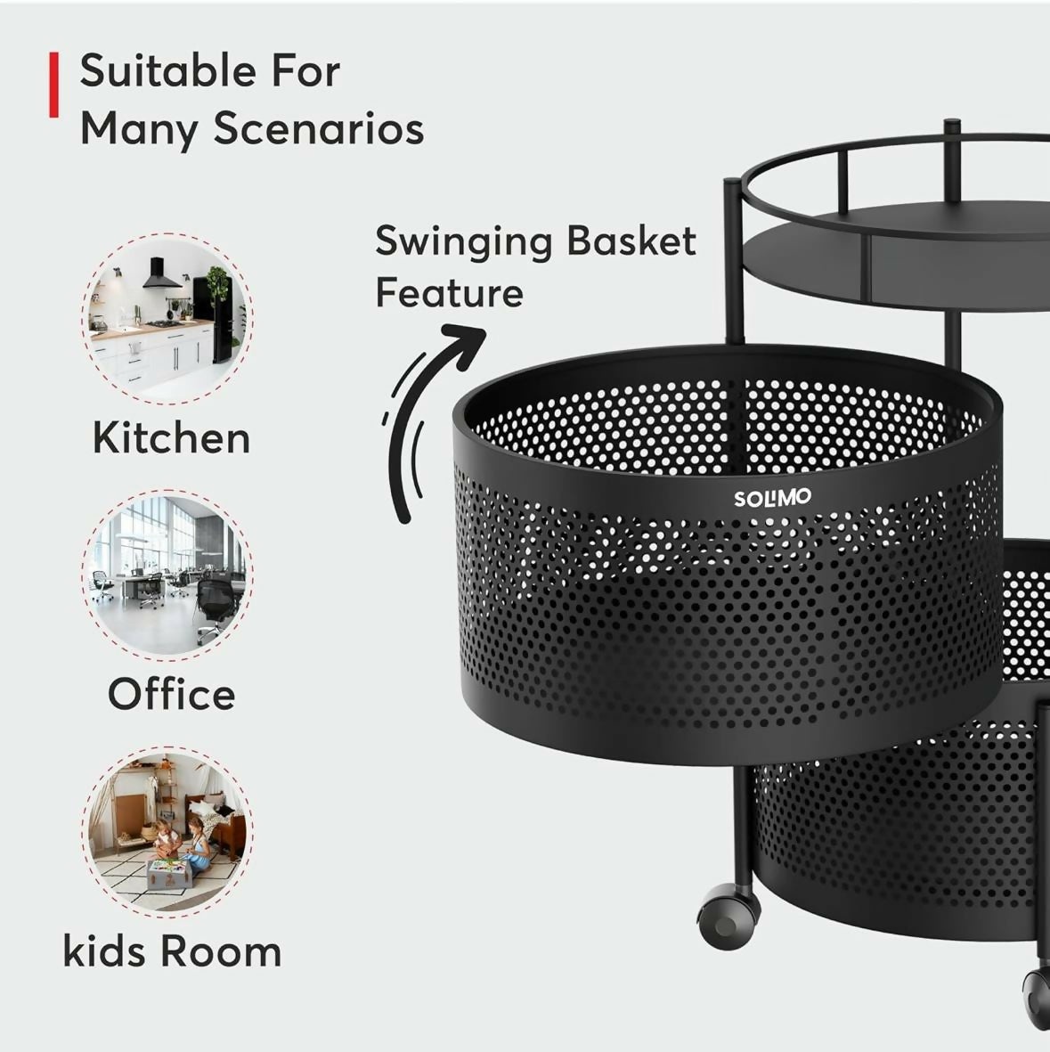 Maximize small-kitchen storage with this sleek round trolley. Two ventilated mesh baskets keep fruits and veggies fresh, while the rust-resistant metal frame and four 360° swivel wheels let you move supplies effortlessly wherever you need them.
