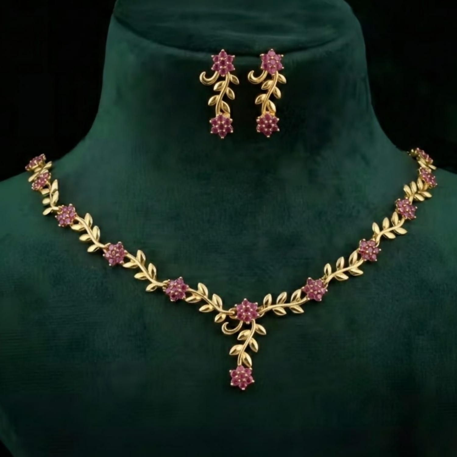 Matching earrings are placed above the necklace. Each earring features a similar floral and leaf motif, maintaining a cohesive design with the necklace.