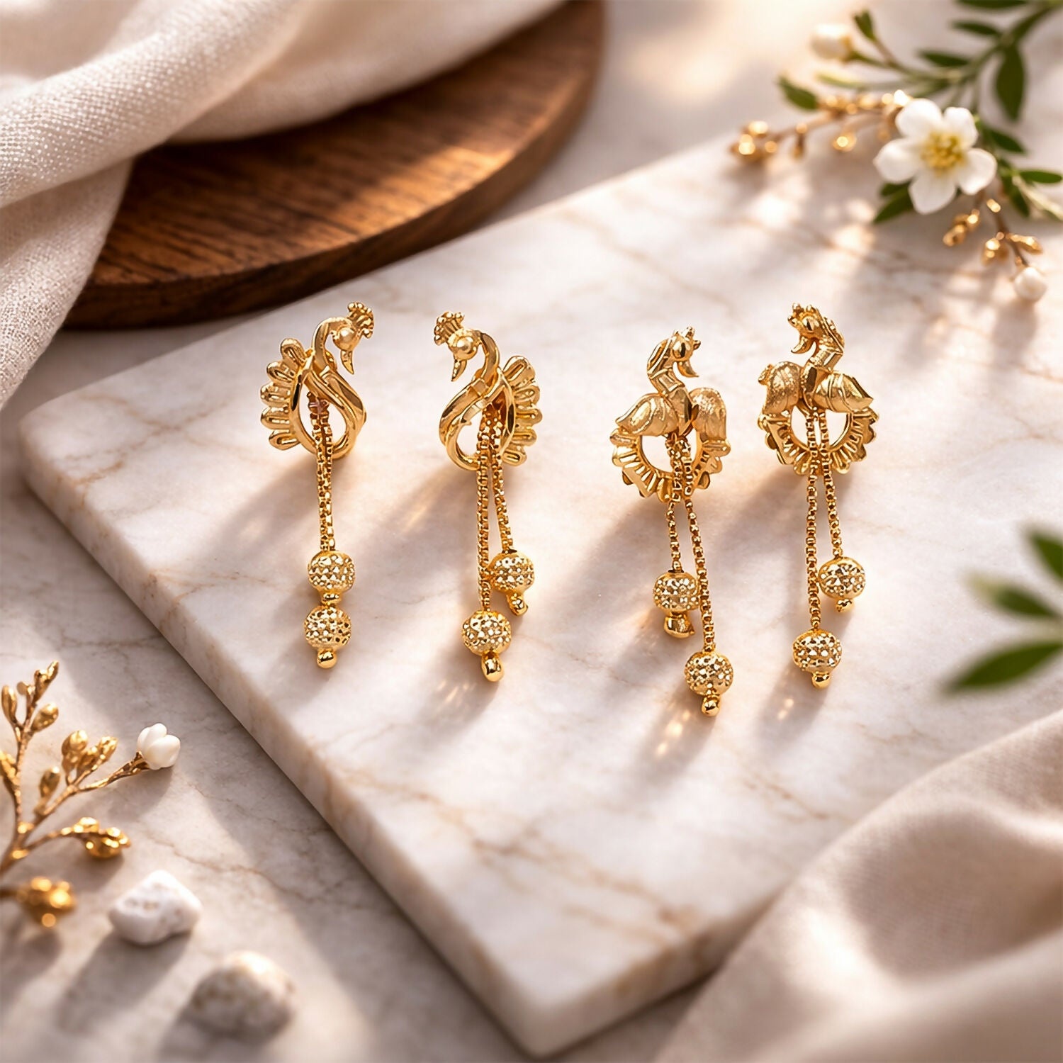 This combo includes two pairs of uniquely designed peacock-style dangling earrings, each showcasing artistic detailing and a rich gold-tone finish. The elegant drop chains with textured beads add a sophisticated touch, giving the earrings a luxurious and eye-catching look. Their traditional yet versatile design makes them perfect for pairing with ethnic outfits such as sarees, lehengas, salwar suits, and even modern fusion wear.