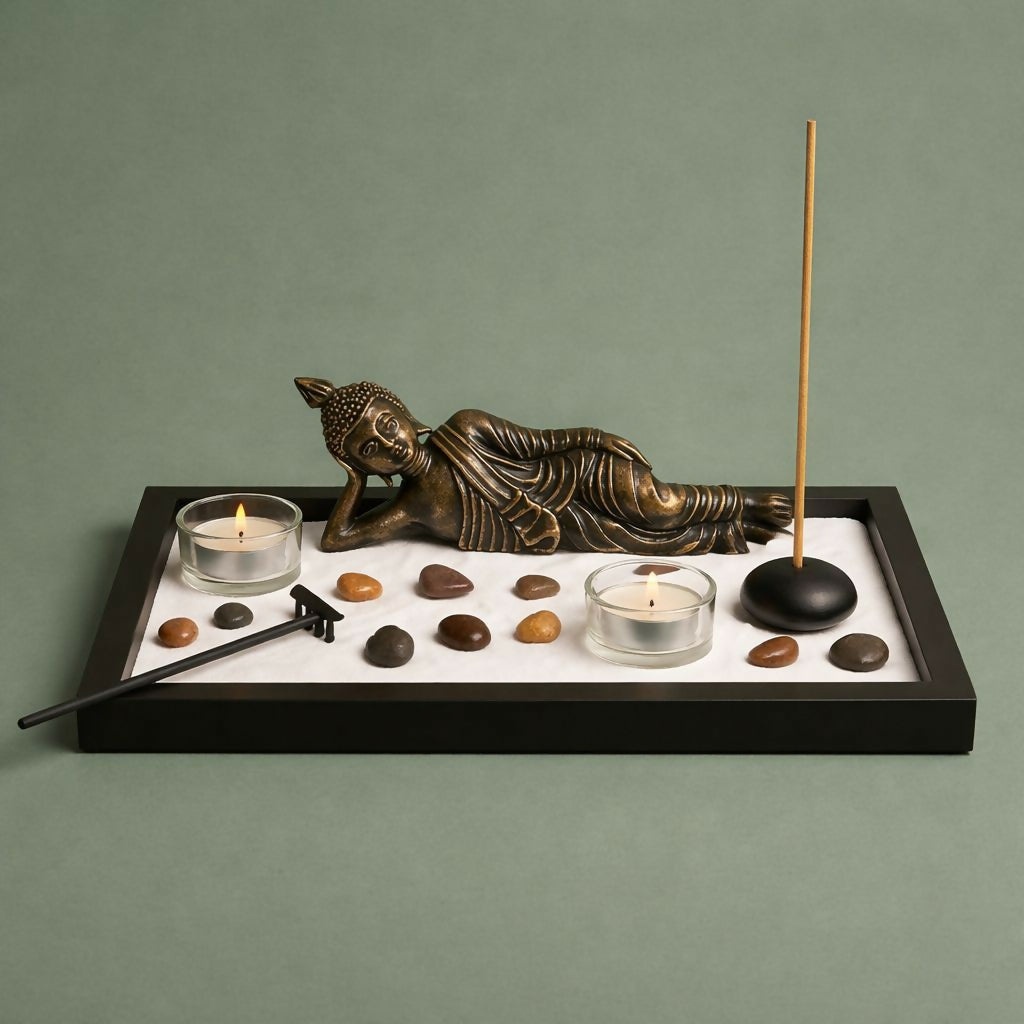 Create a peaceful and relaxing atmosphere with this elegant Zen Buddha meditation garden décor set. Featuring a reclining Buddha statue placed on a decorative tray with sand, stones, candles, and an incense holder, this set is designed to bring calmness and balance to your space. The minimalist design makes it a beautiful addition to living rooms, meditation corners, office desks, or yoga spaces. Perfect for creating a serene ambiance, this decorative set also makes a thoughtful gift for housewarmings, festivals, or special occasions.