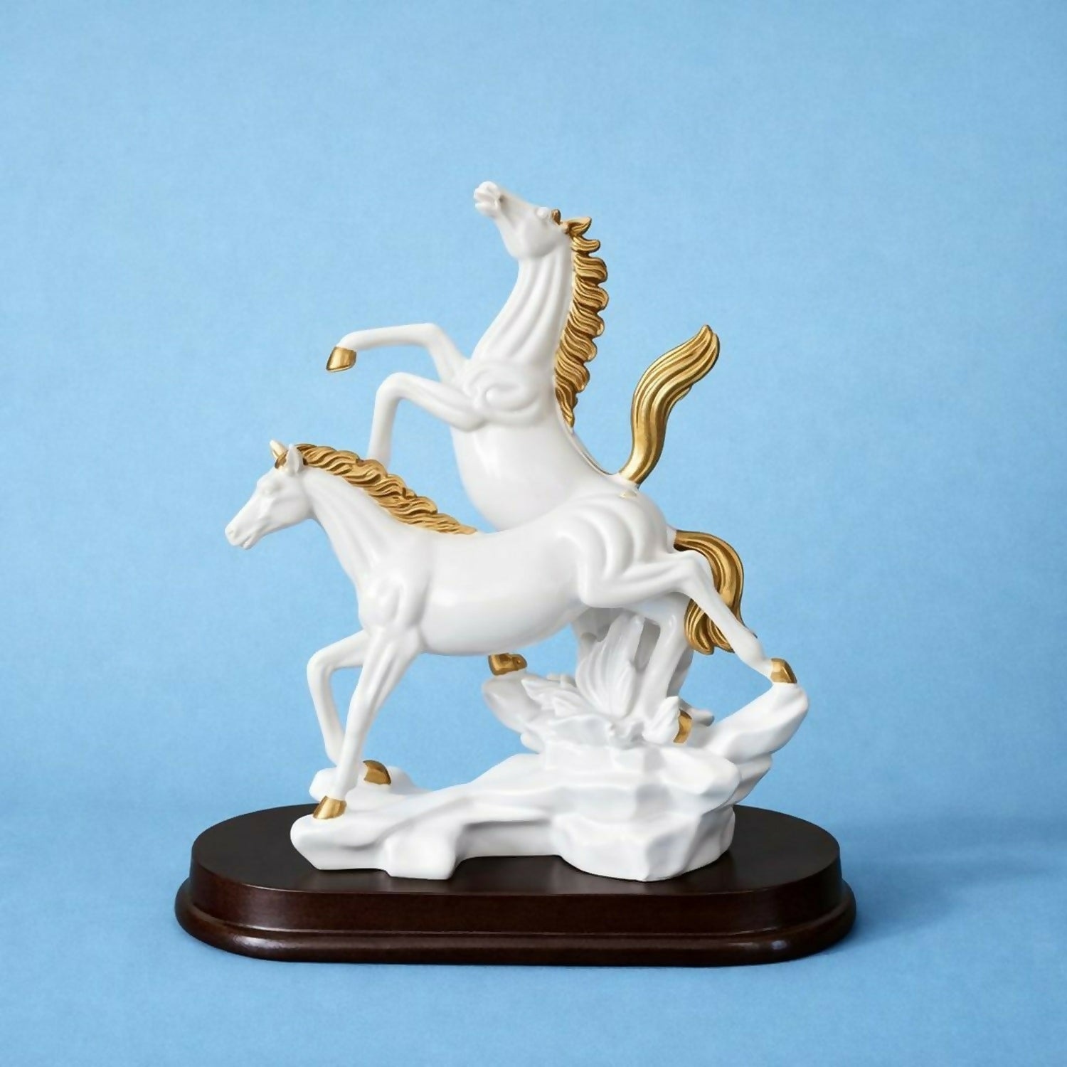Enhance your décor with this beautifully crafted double horse decorative showpiece. Designed with elegant detailing, the statue represents strength, energy, and success. The stylish white finish with golden accents gives it a premium and modern appearance, making it perfect for home décor, office desks, reception counters, and display shelves. Mounted on a sturdy base, this decorative sculpture adds a luxurious artistic touch to any space and also makes a thoughtful gift for special occasions.