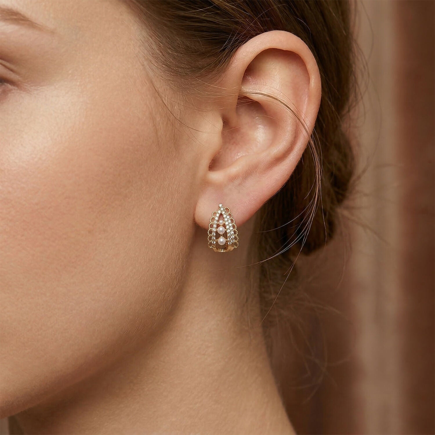 Design: These earrings feature a unique arched silhouette encrusted with micro-crystals. The center is adorned with three vertically aligned pearls of graduating sizes, flanked by delicate golden lace-like detailing on the sides.