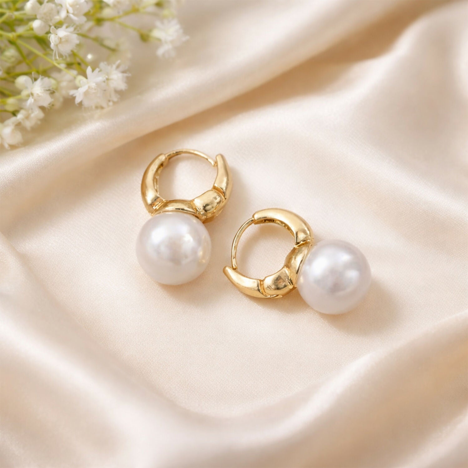 Design: These earrings feature a high-luster, oversized pearl with a delicate pinkish-blush tint, suspended from a thick, polished gold-plated huggie hoop. The secure latch-back design ensures both style and comfort.