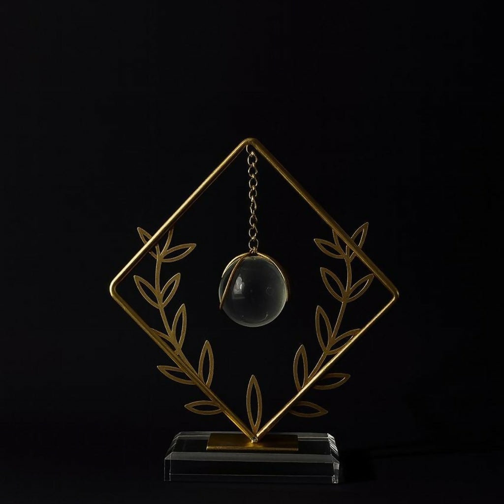 Add a touch of modern elegance to your home or office with this stylish crystal orb decorative showpiece. Designed with a sleek geometric metal frame and delicate leaf patterns, this décor piece features a suspended crystal sphere that creates a unique and eye-catching visual effect. The golden metal structure paired with a clear crystal ball and sturdy base gives it a luxurious and contemporary appearance. Perfect for decorating living rooms, office desks, shelves, or center tables, this artistic sculpture enhances the aesthetic appeal of any interior space. It also makes a wonderful gift for housewarmings, weddings, and special occasions.