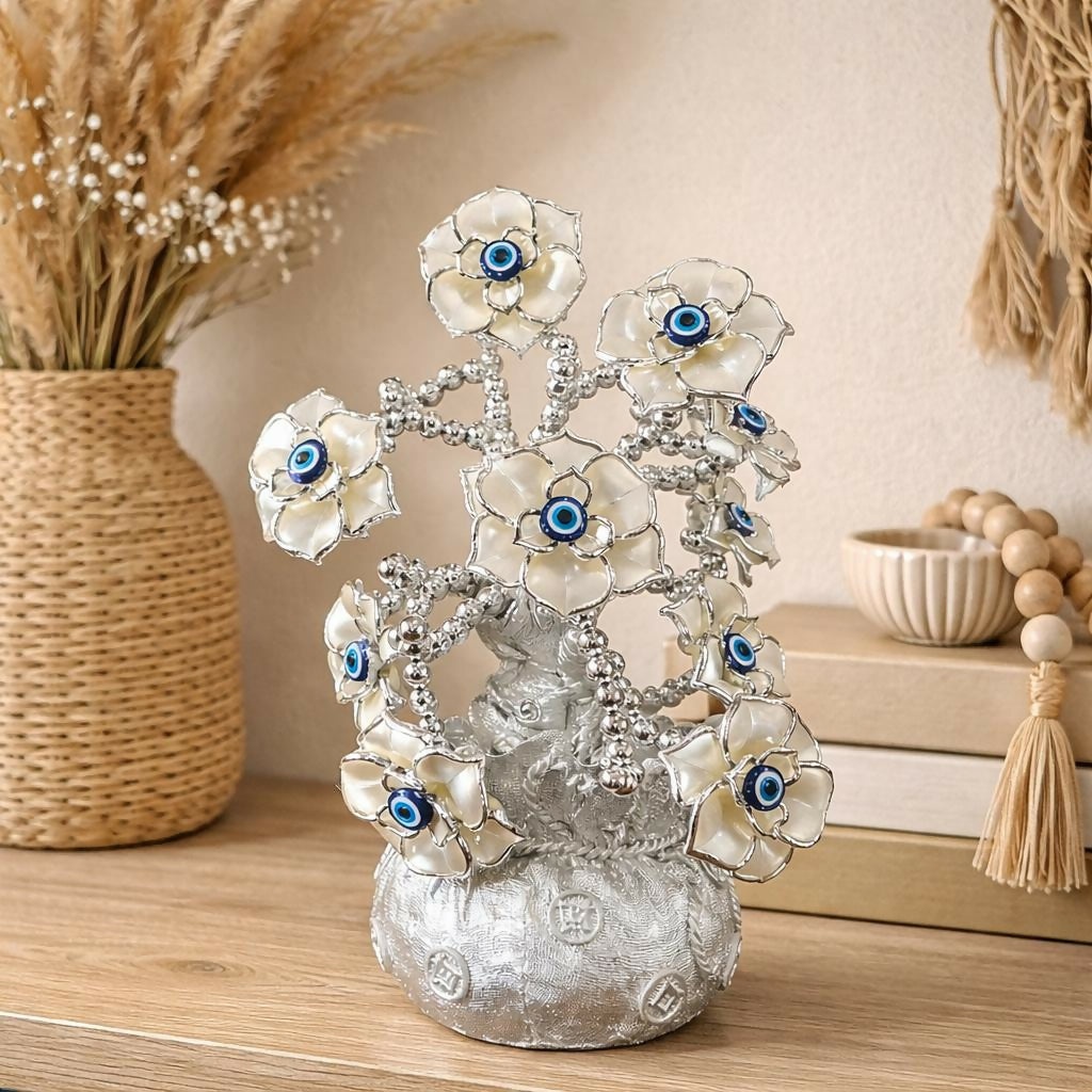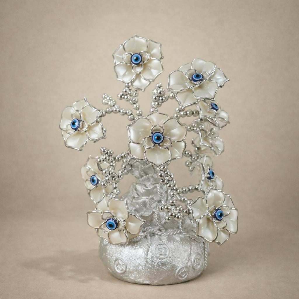 Silver Lucky Flower Tree Showpiece with Evil Eye Home Decor Statue