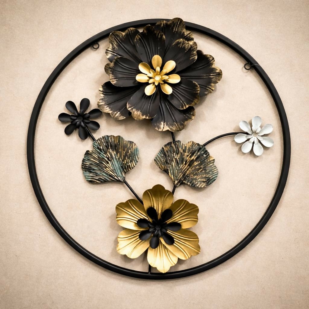 Enhance your interiors with this elegant metal floral round wall art décor. Featuring beautifully crafted flowers and leaves within a modern circular frame, this decorative wall hanging adds a sophisticated and artistic touch to any space. The stylish combination of black and gold tones creates a luxurious look that complements both modern and classic interiors. Perfect for living rooms, bedrooms, hallways, offices, or entrance walls, this decorative wall sculpture brings nature-inspired beauty and elegance to your home. It also makes a wonderful gift for housewarmings, weddings, and festive occasions.