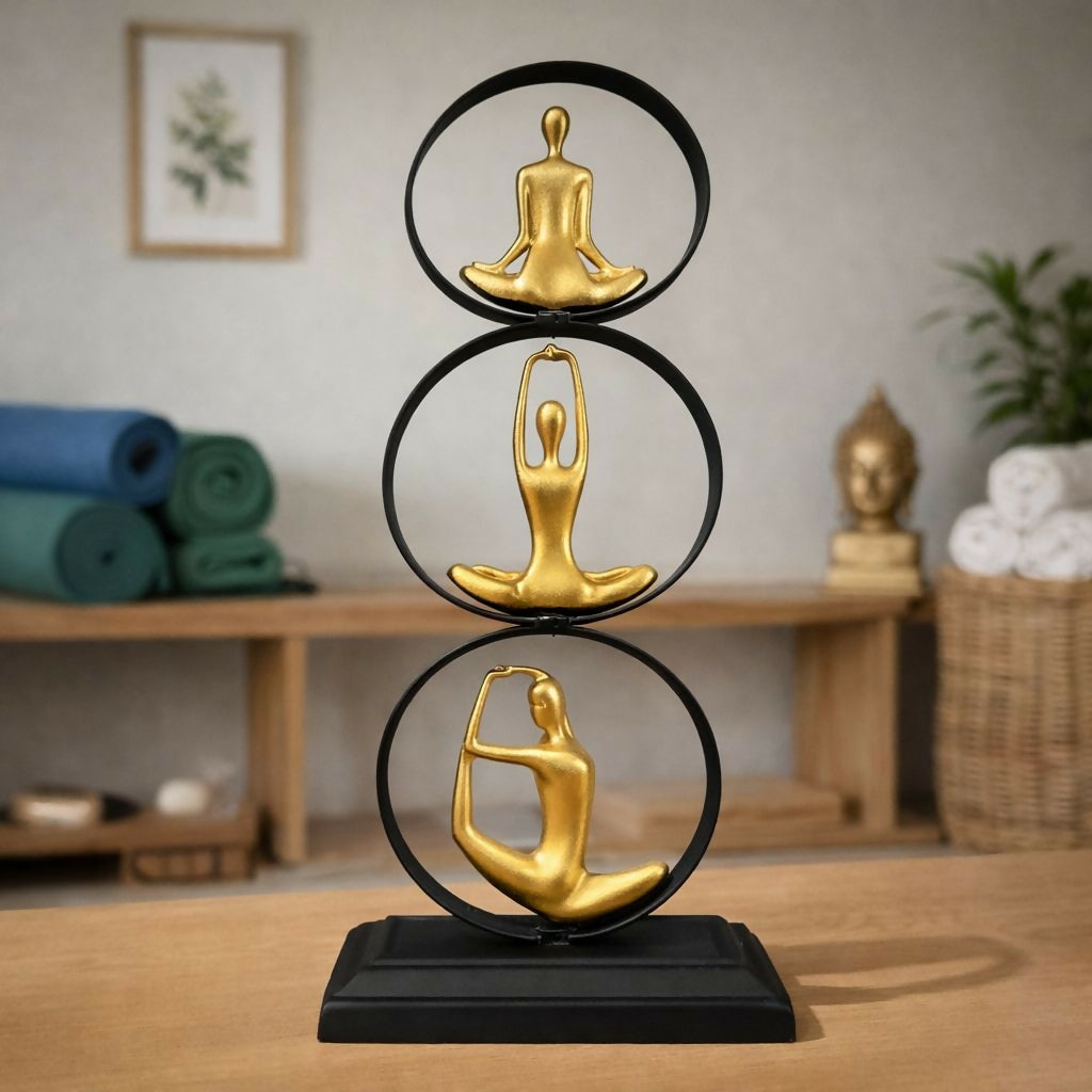 Add a touch of elegance and serenity to your home or office with this beautiful golden yoga meditation figurine showpiece. Designed with three artistic yoga poses placed inside circular frames, this modern decorative sculpture represents balance, peace, and mindfulness. The stylish black base combined with the golden finish creates a luxurious and contemporary look that enhances any interior space. Perfect for living rooms, offices, yoga studios, meditation corners, or shelves, this artistic décor piece symbolizes calmness and positive energy. It also makes a thoughtful gift for yoga lovers, wellness enthusiasts, and home décor collectors.