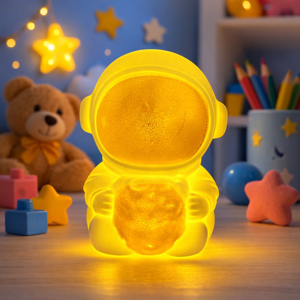 Create a magical space-themed atmosphere with this adorable Astronaut LED Night Lamp. Designed as a cute astronaut holding a glowing moon, this decorative lamp emits a soft warm light that is perfect for bedtime, relaxation, and room décor. Its compact design makes it ideal for bedside tables, study desks, shelves, or kids’ rooms. The charming astronaut shape adds a playful touch while providing gentle lighting that makes the room feel cozy and inviting.