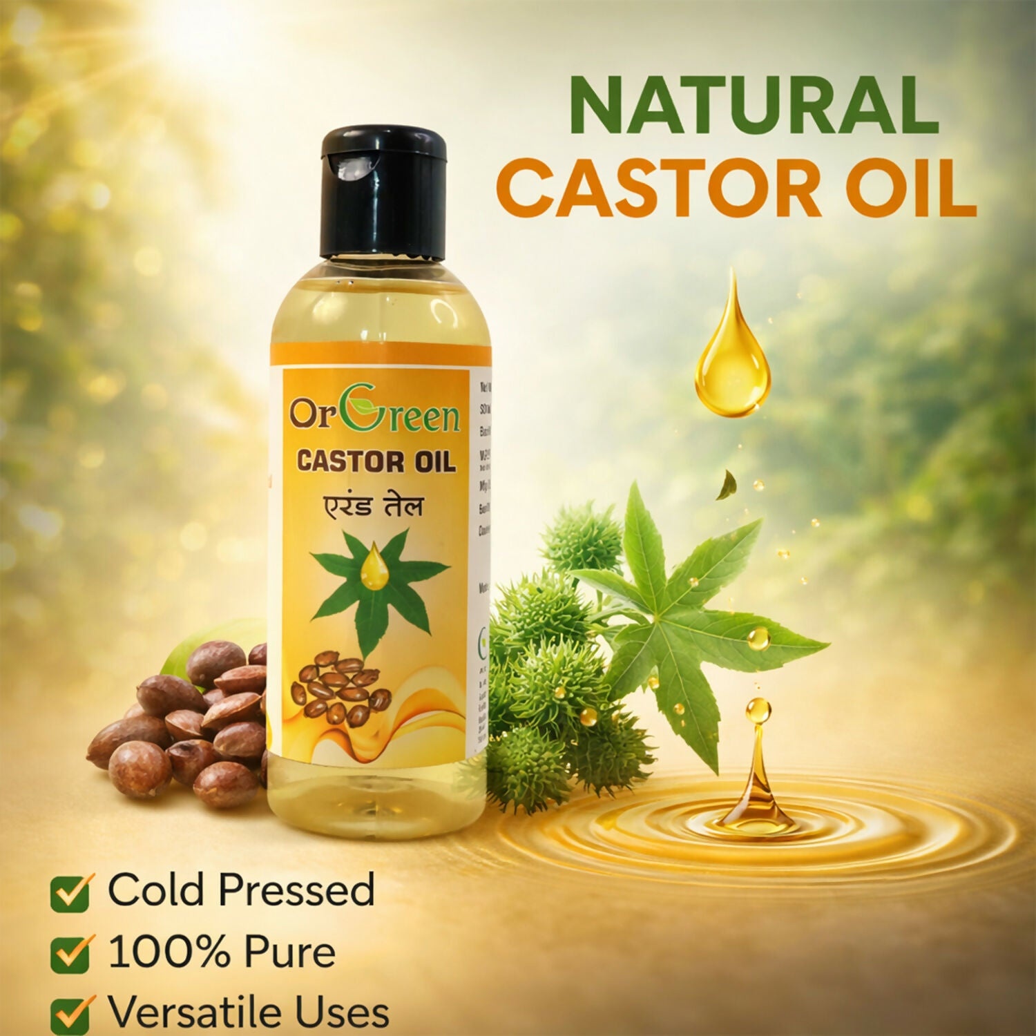 OrGreen Castor Oil is a 100% pure and natural oil crafted for versatile beauty and personal care uses. Extracted through a cold-pressed process, it helps retain its natural properties without added chemicals or additives. Known for promoting healthy-looking hair, this oil supports scalp nourishment and hair growth. It also works as a deeply moisturizing solution for dry skin, helping to improve softness and smoothness. Ideal for regular hair care, scalp massage, and skin nourishment routines.