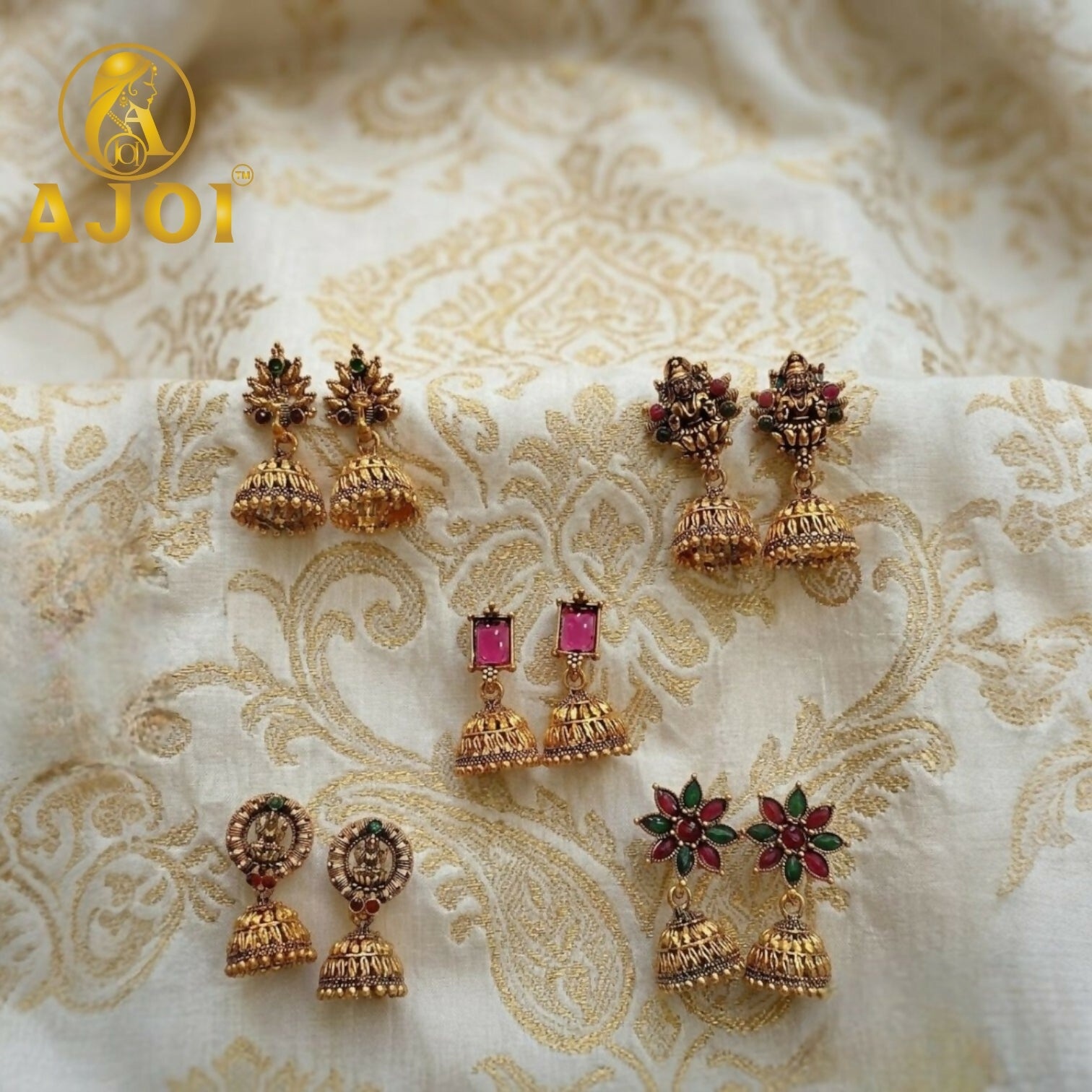 Celebrate heritage craftsmanship with this exquisite Temple Gold Jhumka Collection. Featuring intricate deity motifs, floral stone embellishments, and finely detailed dome designs, each pair radiates traditional elegance. Accented with ruby and emerald-toned stones, these earrings are perfect for weddings, festive occasions, and timeless ethnic styling.