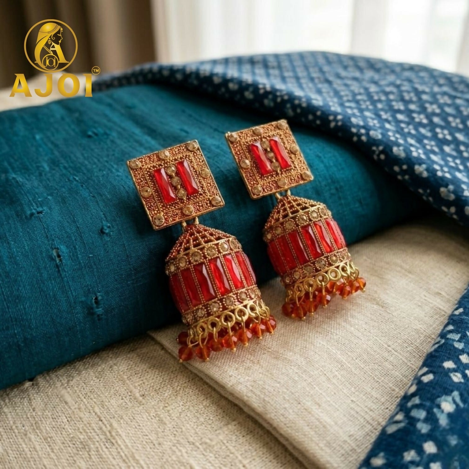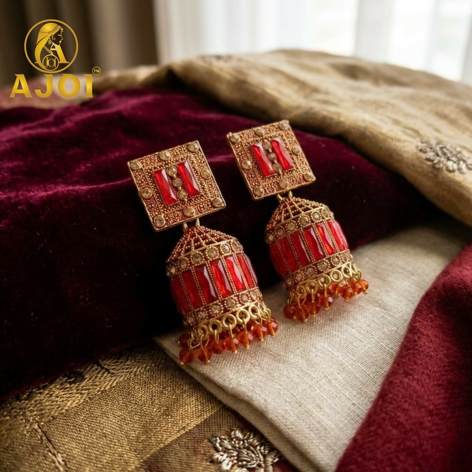 The design flows into a beautifully structured dome-shaped jhumka adorned with symmetrical red stone inlays and delicate gold beaded textures. The finely detailed craftsmanship enhances the richness of the antique finish, while the lower edge is accented with petite red crystal bead danglers that add graceful movement and a vibrant festive glow.