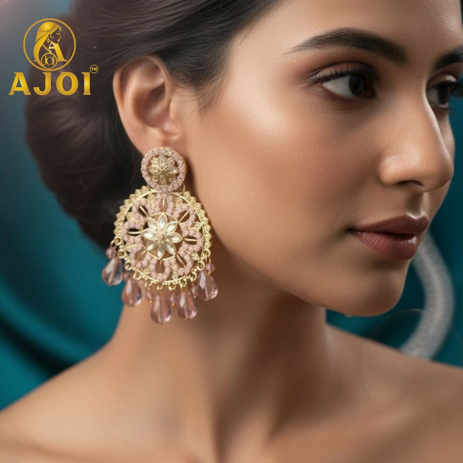 The centerpiece showcases delicate petal motifs highlighted with subtle stone embellishments, while the lower edge is enhanced with shimmering pink teardrop beads that add movement and sophistication. Finished in a rich gold-tone polish, these earrings exude luxury and traditional appeal.