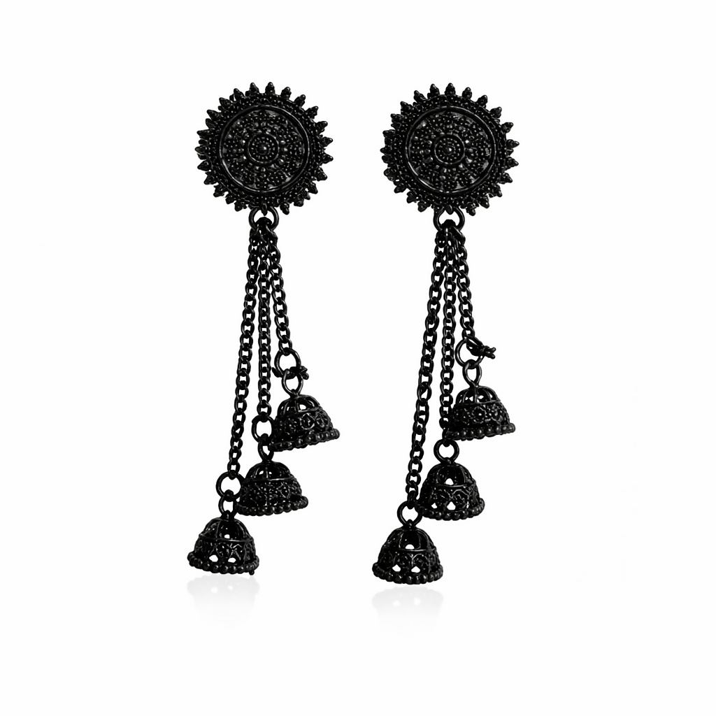 These bold black oxidized earrings feature a beautifully detailed circular stud with an intricate sunburst pattern, giving them a striking traditional appeal. The design flows into cascading chain tassels adorned with delicate mini jhumka bells, creating graceful movement with every step. Elegant yet statement-making, these earrings are perfect for festive occasions, evening wear, and fusion outfits. Their unique black finish adds a modern edge while keeping the essence of classic ethnic charm. ✨