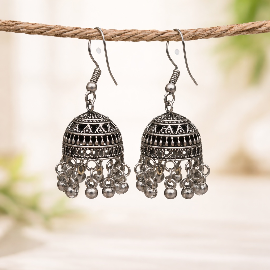 These elegant oxidized silver-tone jhumka earrings feature a beautifully detailed dome design with intricate engraved patterns and delicate cutwork. The base is adorned with multiple tiny metallic beads that create a graceful dangling effect, adding movement and charm with every step. Lightweight yet eye-catching, these traditional earrings are perfect for festive occasions, ethnic wear, and everyday styling with a classic touch.