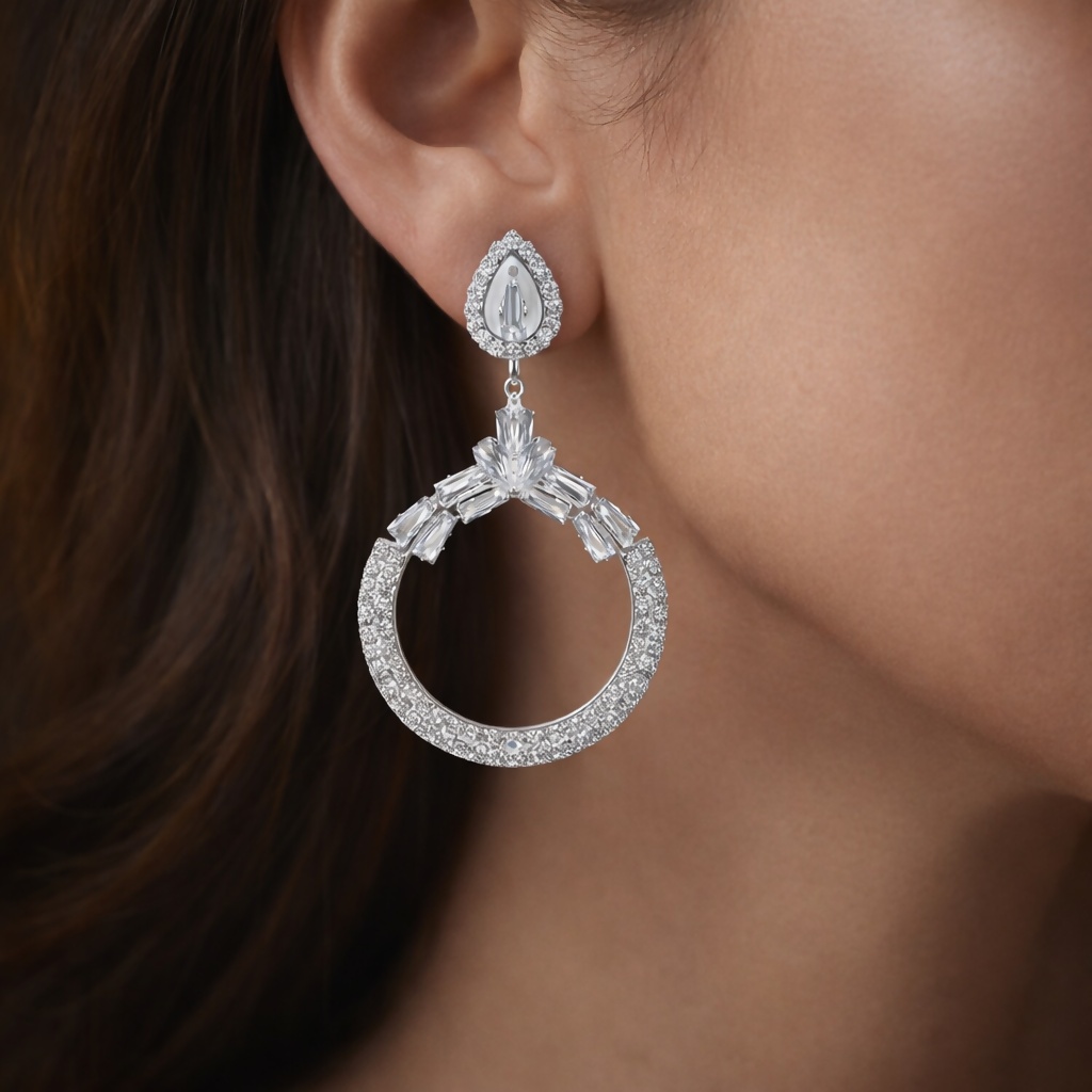 Elevate your elegance with these stunning silver-tone statement earrings, beautifully crafted in a luxurious circular drop design. The top features a delicate teardrop stud surrounded by shimmering stones, leading to a graceful hoop encrusted with fine crystals for maximum sparkle. At the center, a floral-inspired arrangement of baguette and marquise-cut stones adds a touch of sophistication and brilliance. Perfect for weddings, parties, and festive occasions, these glamorous earrings are designed to make you shine effortlessly.Â