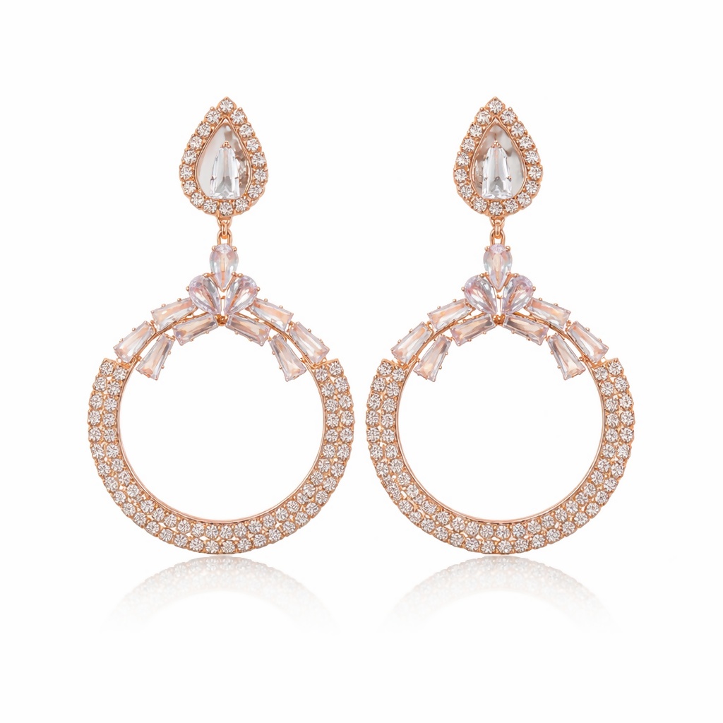 Add a touch of royal glamour to your collection with these exquisite rose gold–tone statement earrings. Designed with a sparkling teardrop stud at the top, they flow into a stunning floral arrangement of baguette and marquise-cut stones, creating a graceful and eye-catching look. The circular hoop is beautifully encrusted with fine shimmering crystals, enhancing its luxurious shine. Perfect for weddings, festive celebrations, and evening parties, these elegant earrings are crafted to make you stand out with timeless sophistication.Â