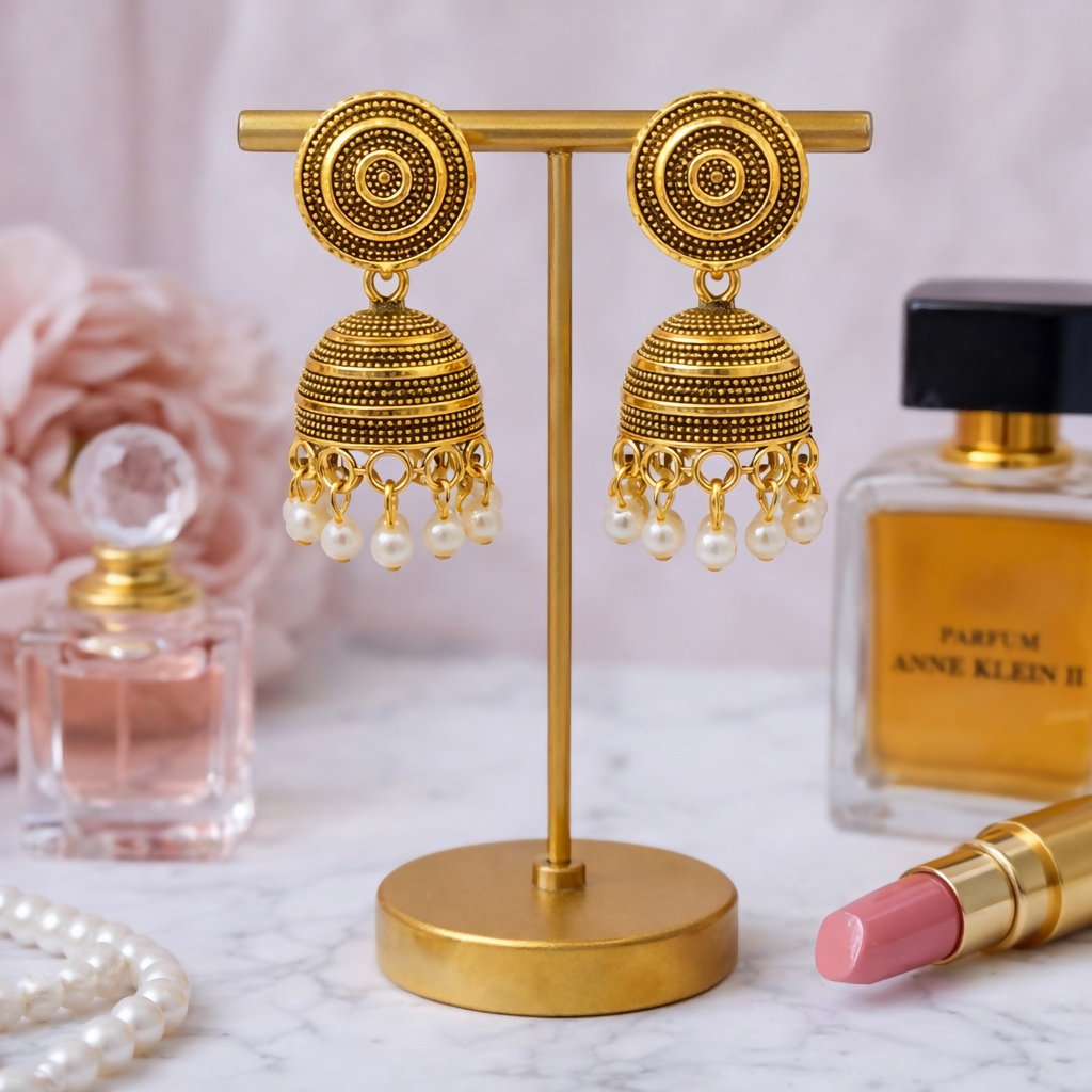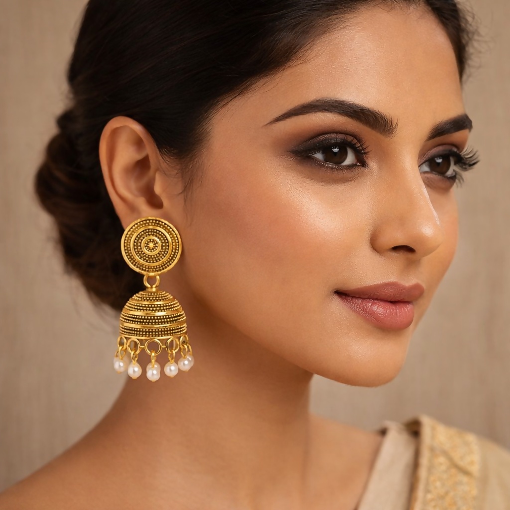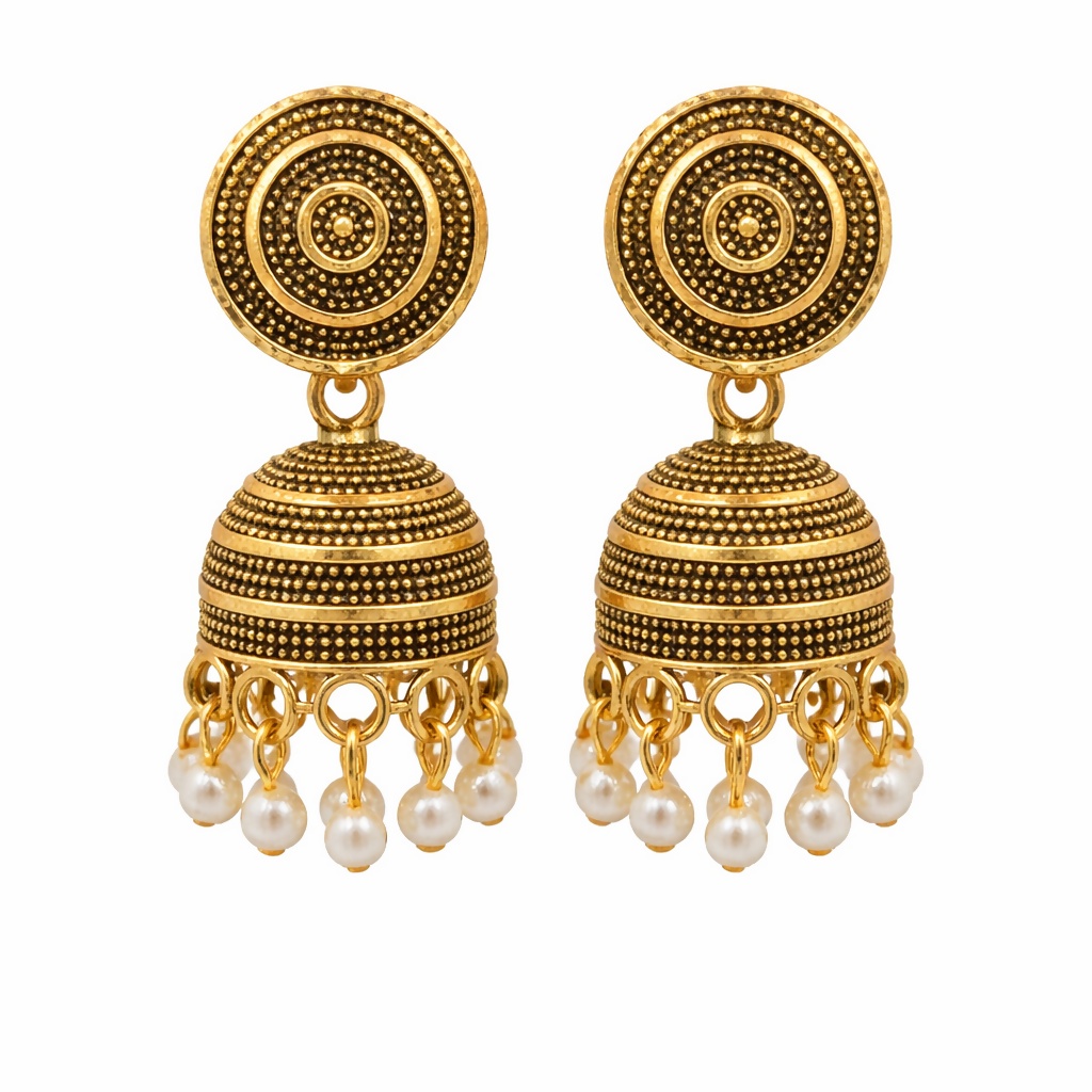 These elegant gold-tone jhumka earrings feature a beautifully detailed circular stud with intricate concentric beadwork, paired with a classic dome-shaped drop design. The finely textured pattern adds a rich traditional touch, while the delicate pearl beads dangling at the bottom enhance their graceful charm. Perfect for festive occasions, weddings, and ethnic wear, these earrings offer a timeless blend of traditional craftsmanship and modern elegance. Lightweight and stylish, they are an ideal addition to any jewellery collection. ✨