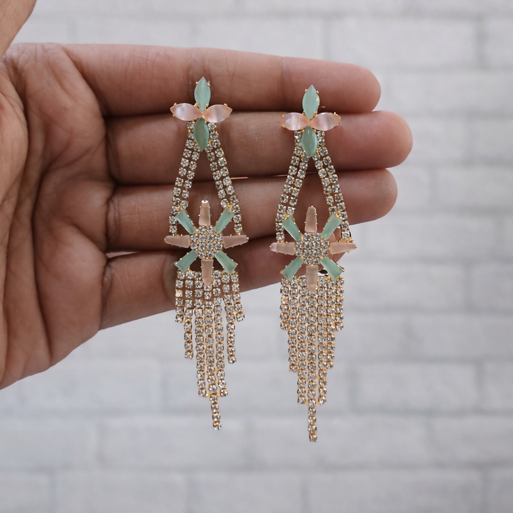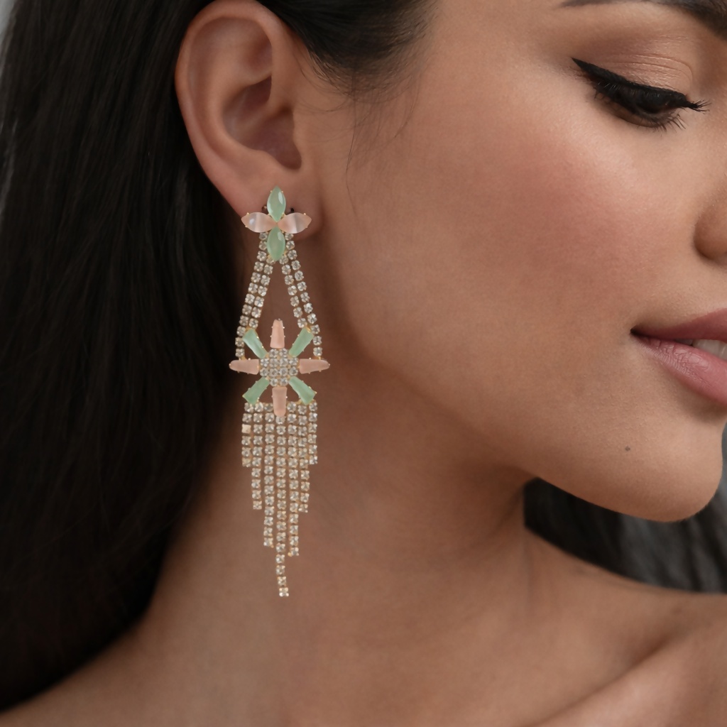Add a touch of glamour to your look with these stunning pastel floral chandelier earrings. Designed with a delicate blend of soft mint green and blush pink stones, these earrings feature an intricate floral motif at the center, surrounded by sparkling crystal accents.