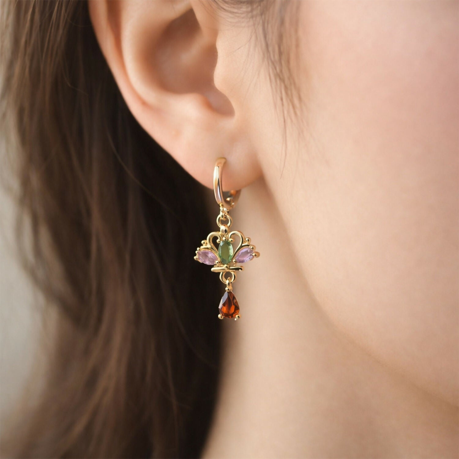 Inspired by regal crown motifs, these stunning multicolor crystal dangle earrings bring a graceful blend of elegance and charm. The design features a beautifully structured floral-crown pattern adorned with green and lavender marquise stones, creating a vibrant and balanced look. Suspended below is a rich amber-toned teardrop crystal that adds depth, movement, and brilliance to the overall design. The polished gold hoop closure ensures a secure and comfortable fit while enhancing the luxurious finish. Perfect for festive occasions, evening gatherings, wedding functions, or adding a royal touch to your outfit, these earrings make a refined and eye-catching accessory.