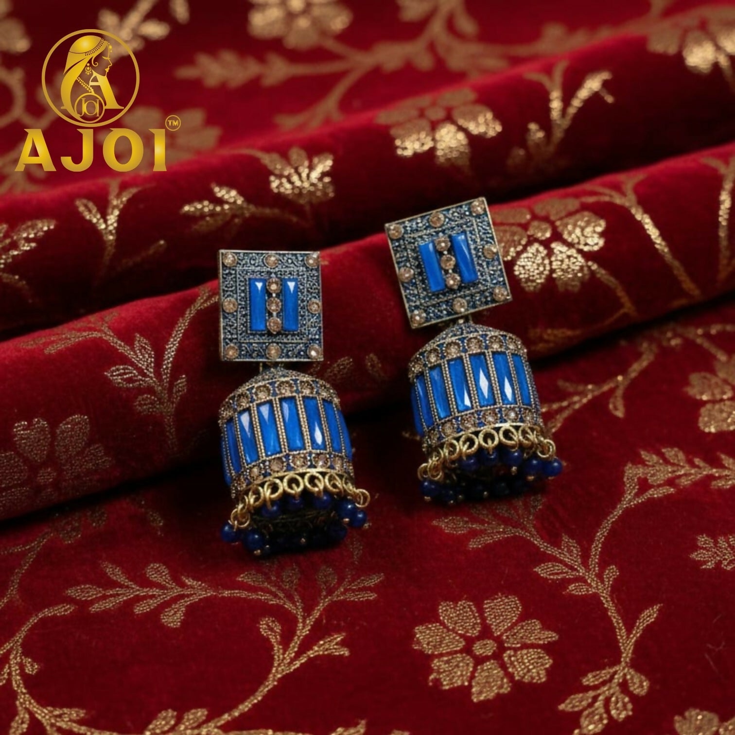 Make a bold royal statement with these premium sapphire blue designer jhumka earrings. Crafted with intricate gold detailing, sparkling stone embellishments, and rich blue accents, this elegant pair beautifully blends timeless tradition with contemporary sophistication—perfect for weddings and grand celebrations.